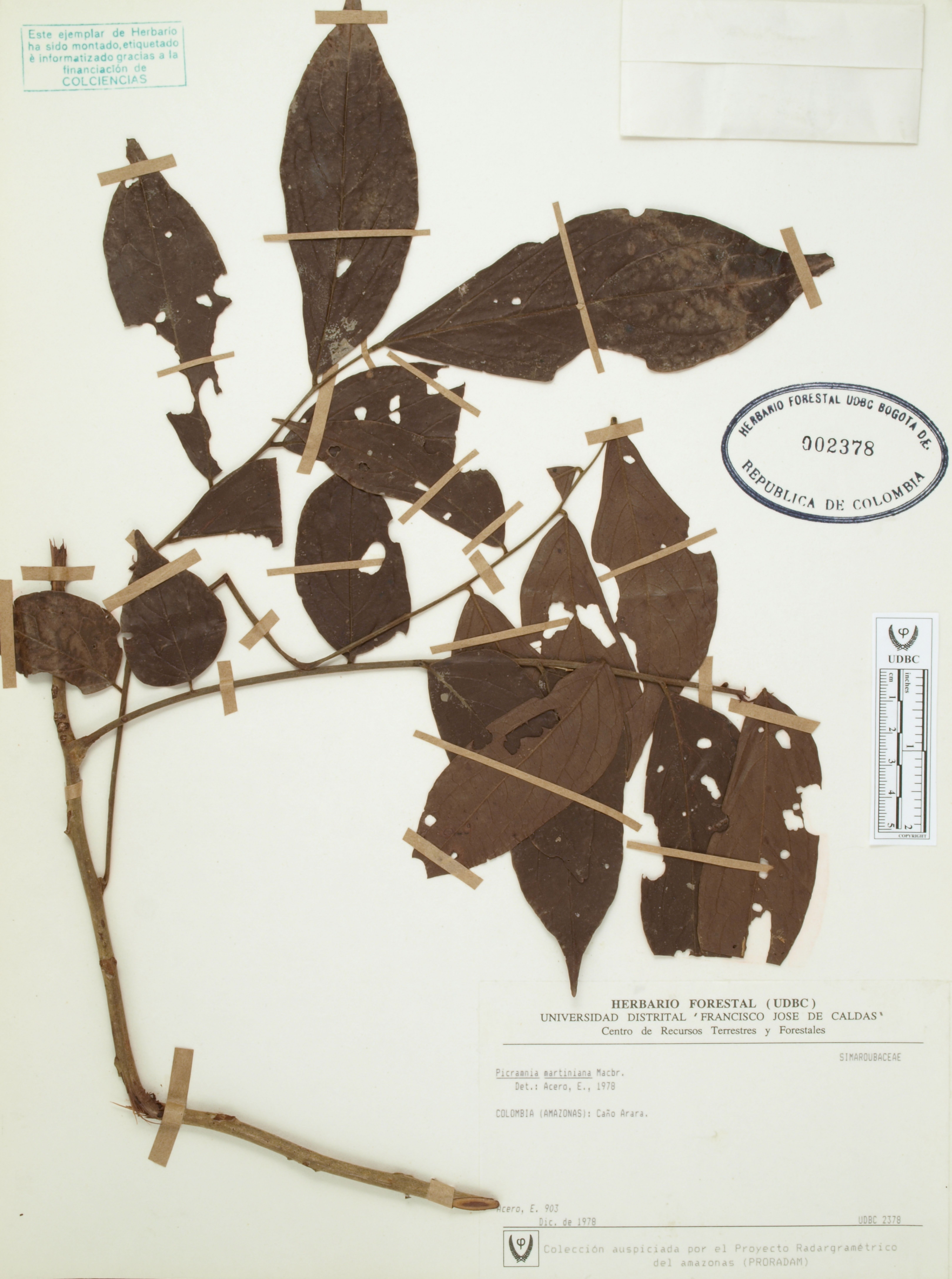 Fotografía del ejemplar Acero, E. 903, determinado como Picramnia martiniana en el año 1978