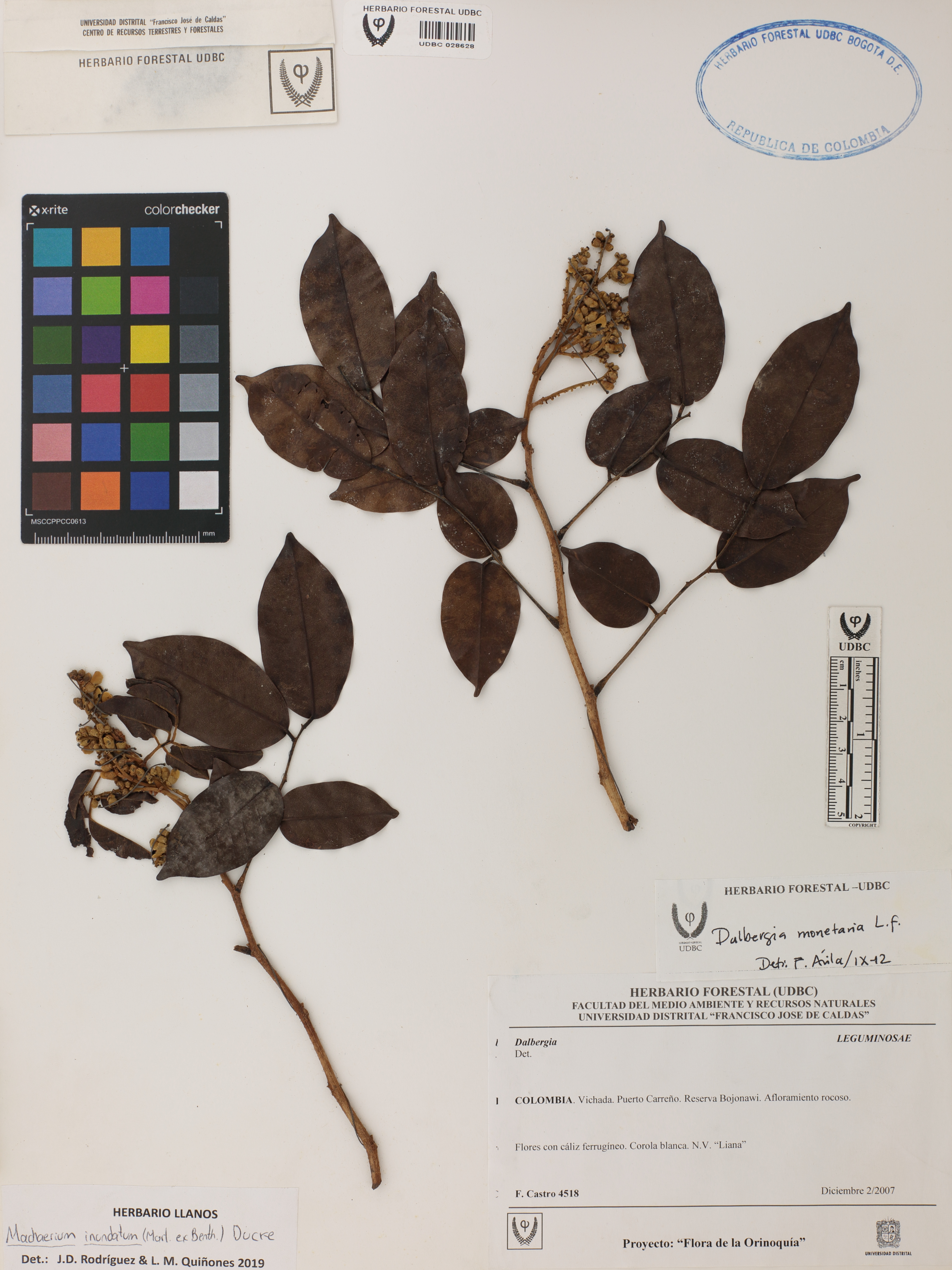 Fotografía del ejemplar Castro, C. 4518, determinado como Machaerium inundatum en el año 2019