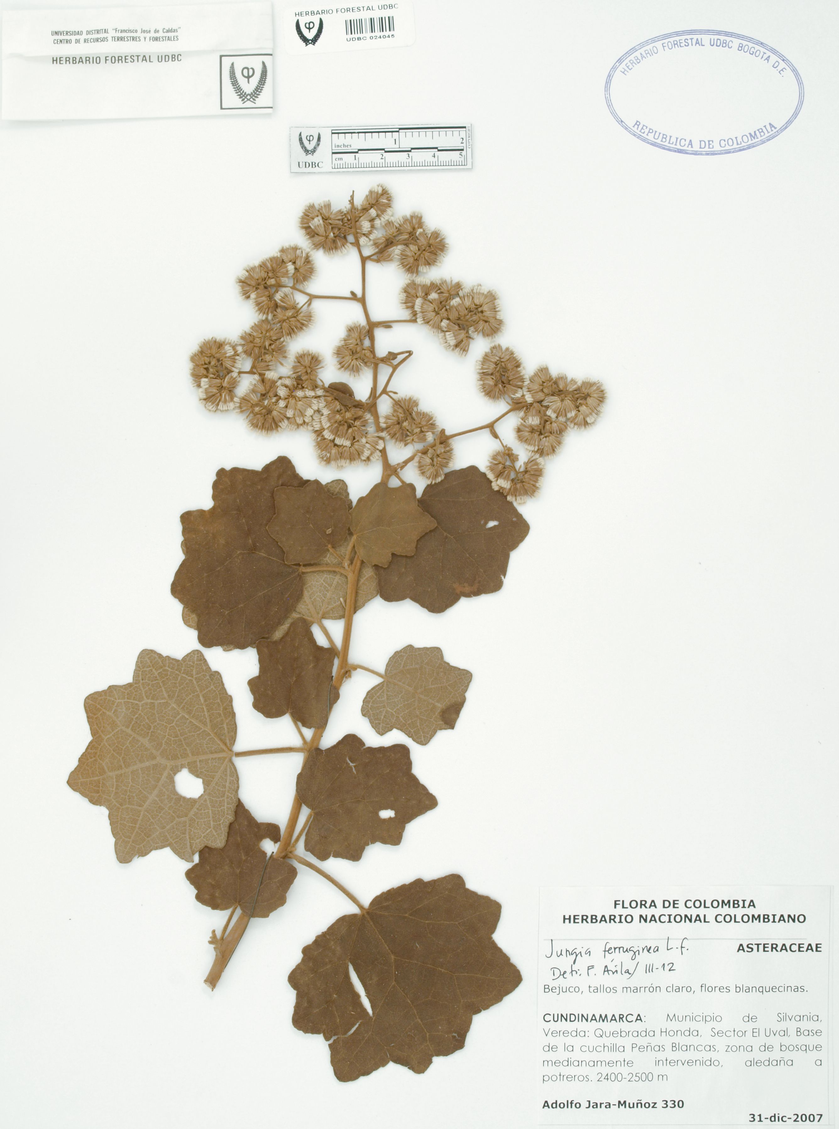 Fotografía del ejemplar Jara-Muñoz, A. 330, determinado como Jungia ferruginea en el año 2012
