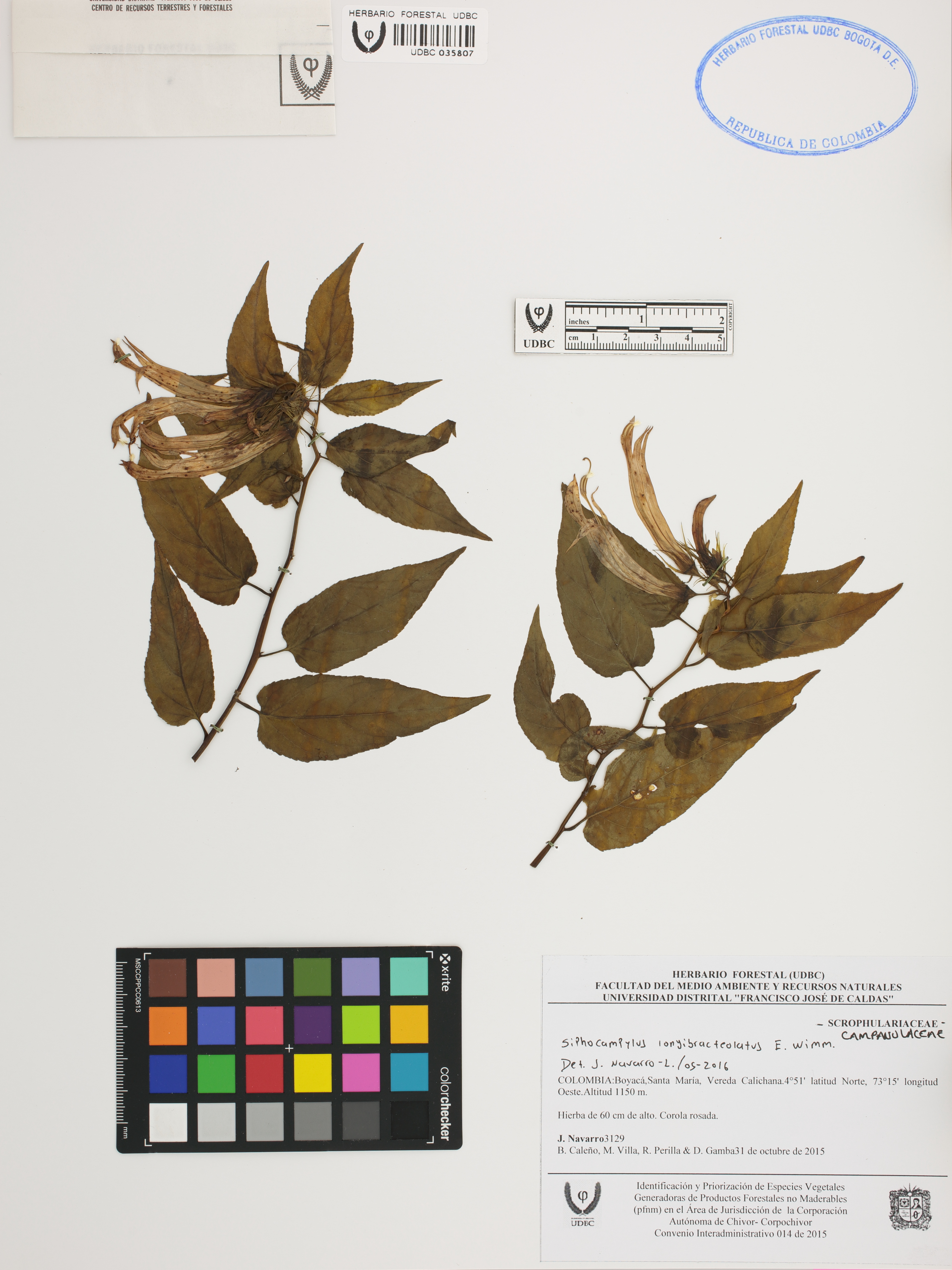 Fotografía del ejemplar Navarro, J. 3129, determinado como Siphocampylus longibracteolatus en el año 2016