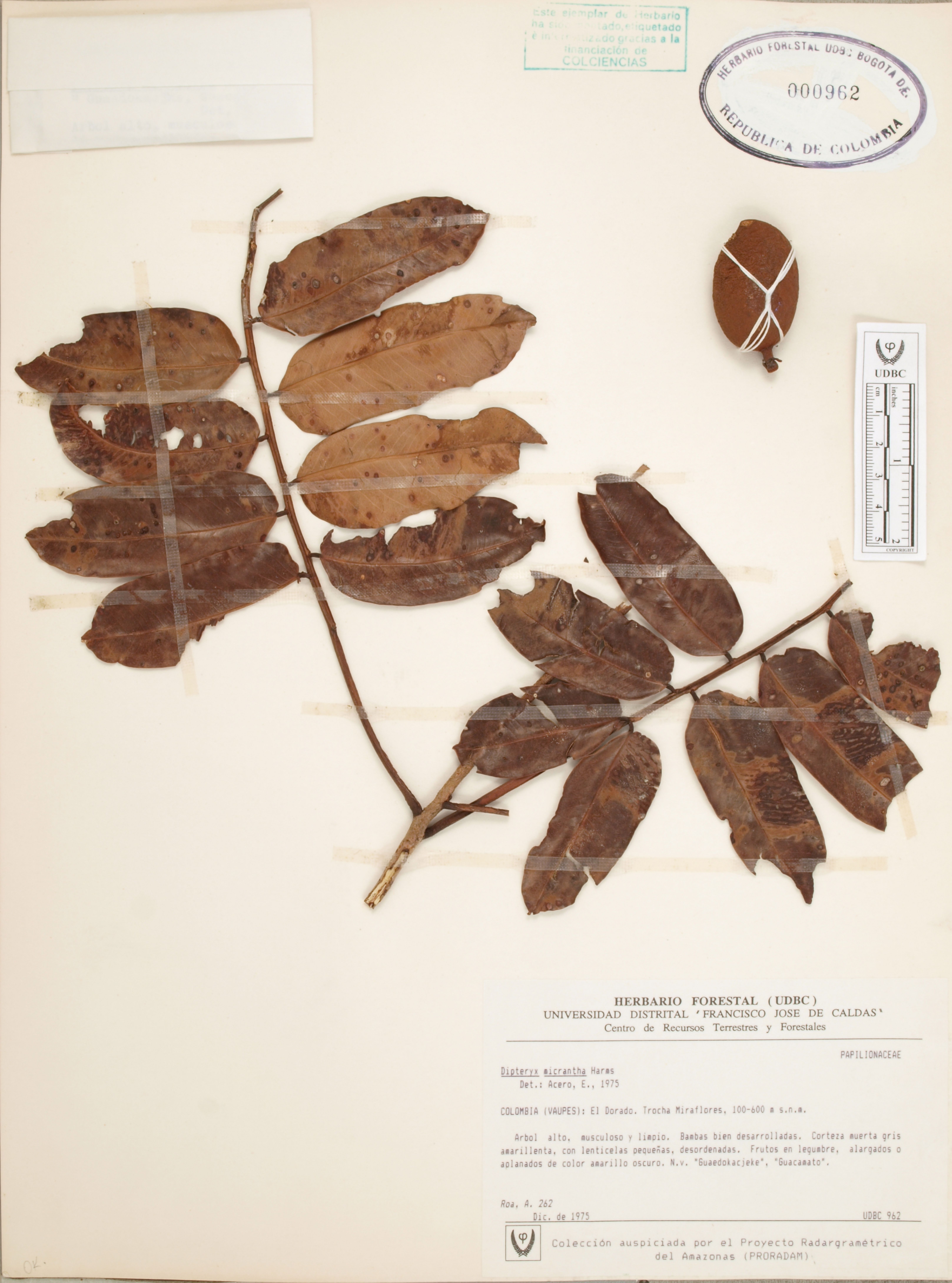 Fotografía del ejemplar Roa, A. 262, determinado como Dipteryx micrantha en el año 1975