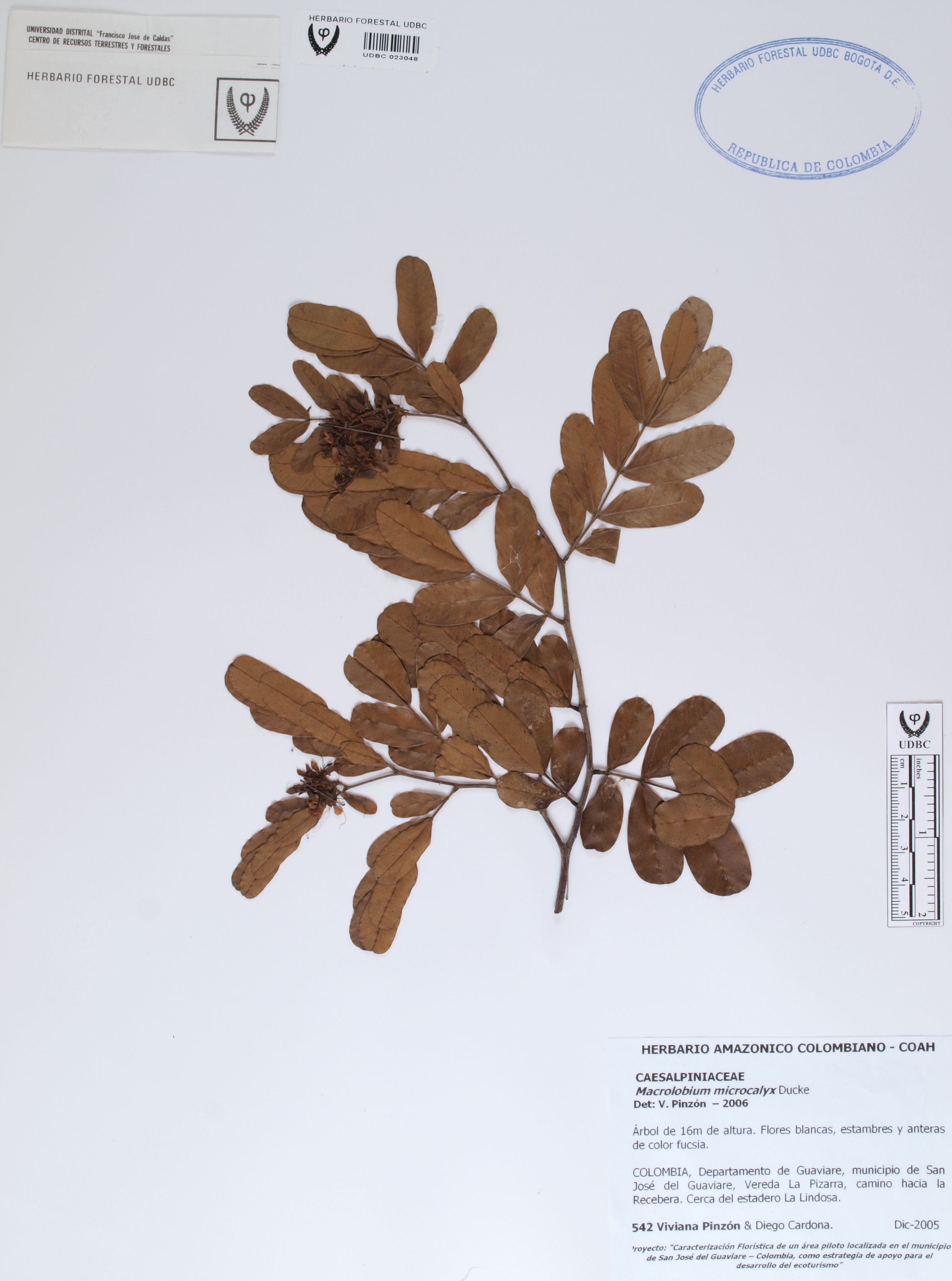 Fotografía del ejemplar Pinzón, V. 542, determinado como Macrolobium microcalyx en el año 2006
