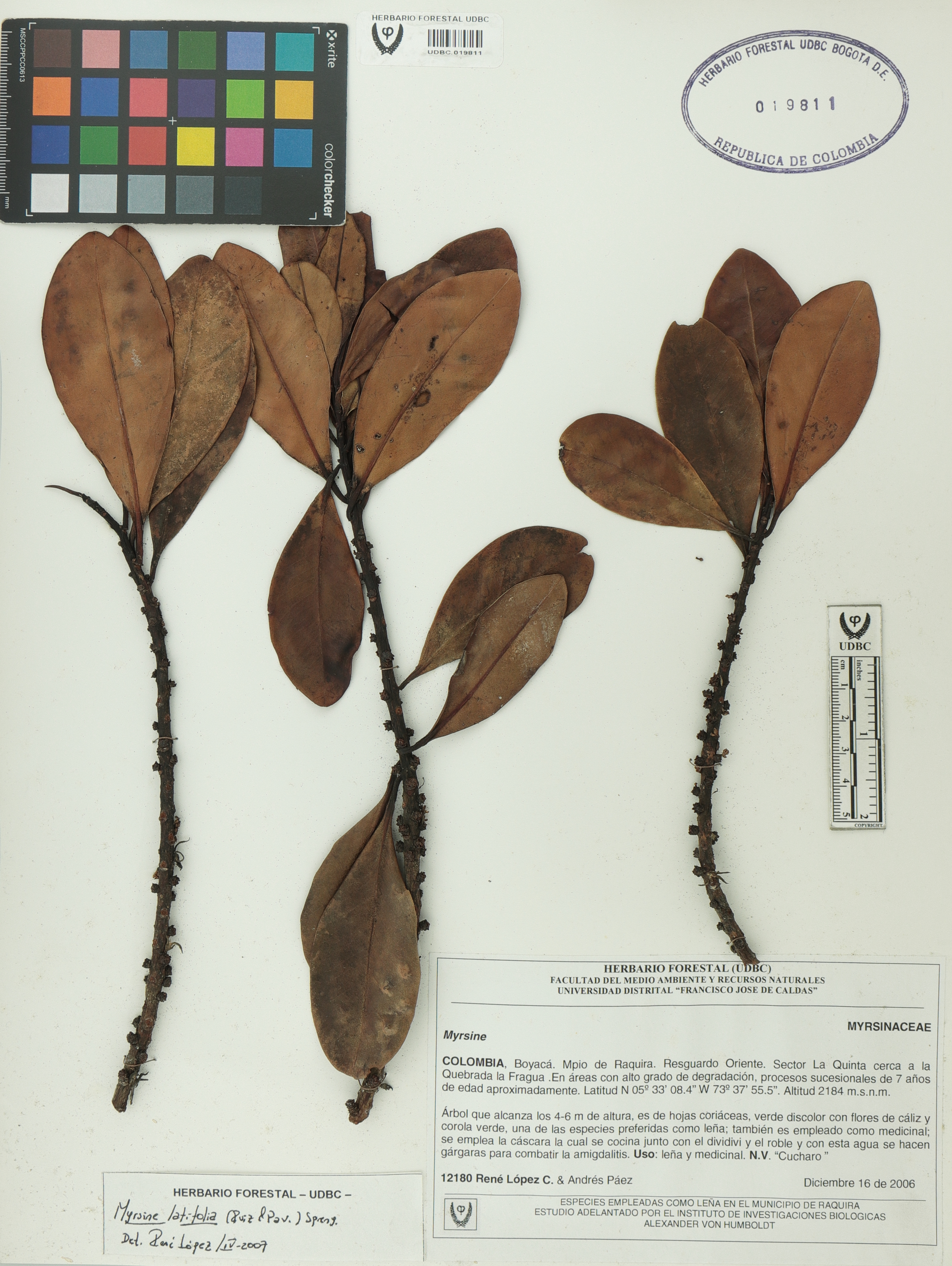 Fotografía del ejemplar López, R. 12180, determinado como Myrsine latifolia en el año 2007