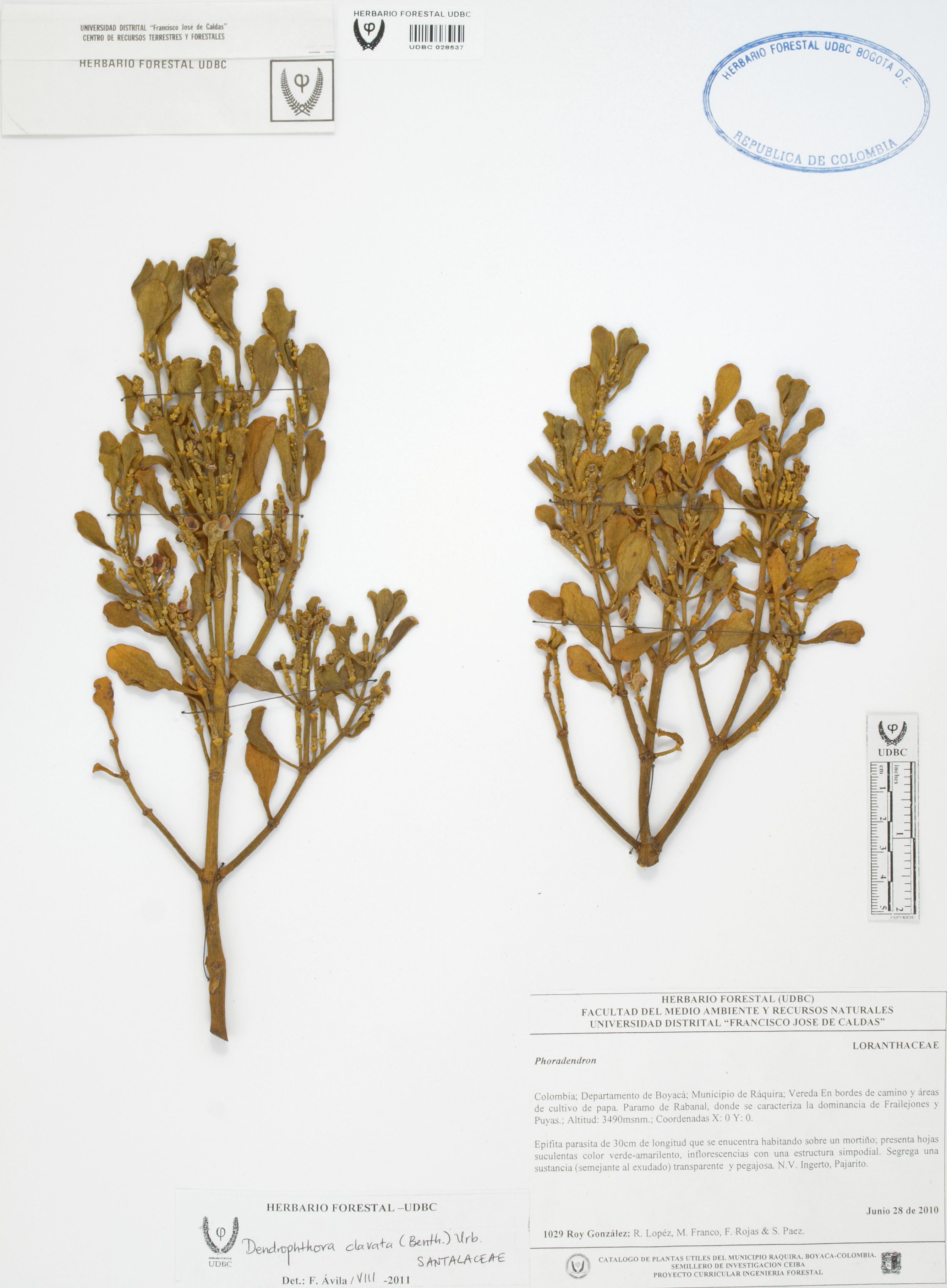 Fotografía del ejemplar González, R. 1029, determinado como Dendrophthora clavata en el año 2011