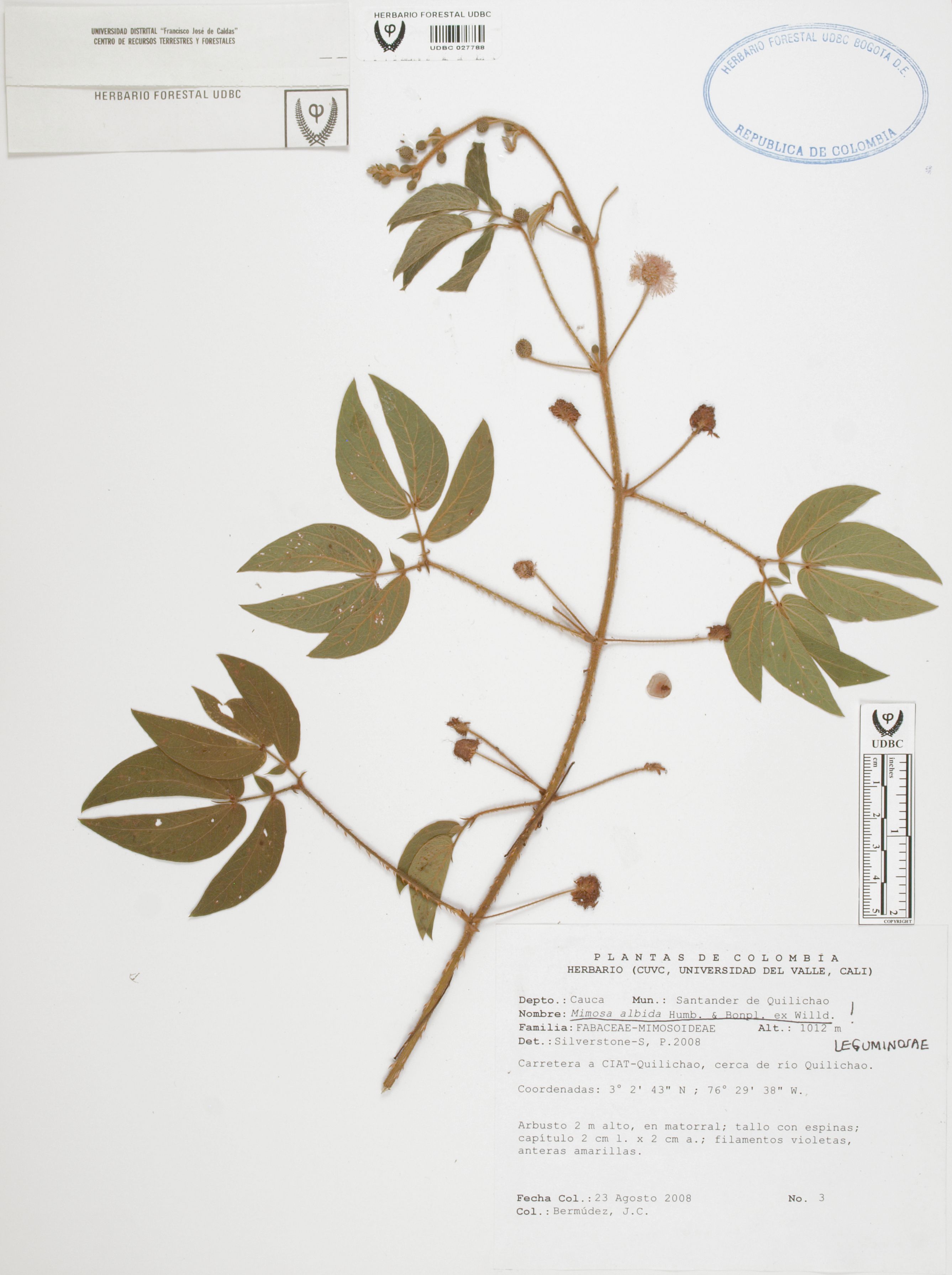 Fotografía del ejemplar Bermúdez, J. 3, determinado como Mimosa albida en el año 2008