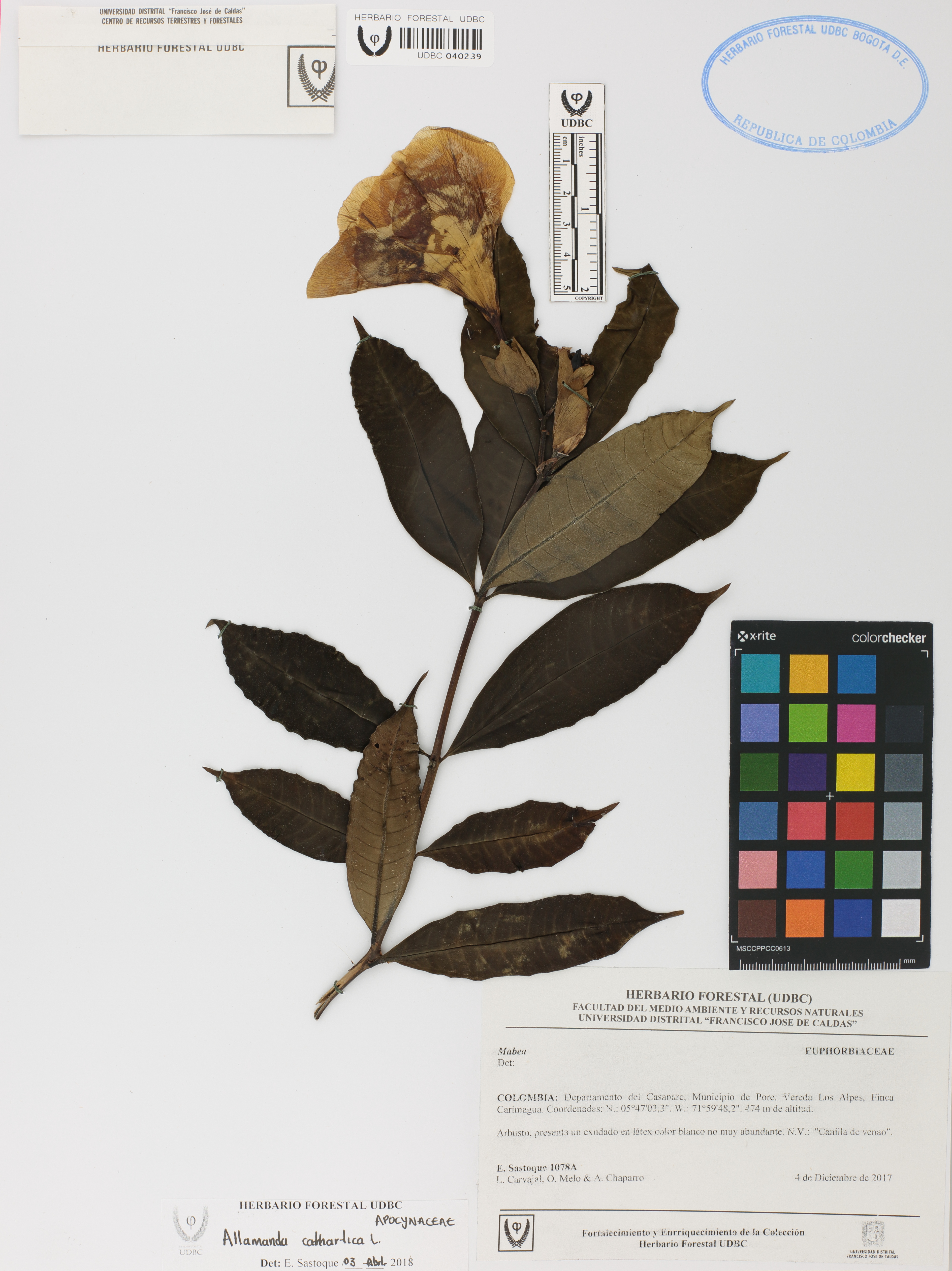 Fotografía del ejemplar Sastoque, E. 1078, determinado como Allamanda cathartica en el año 2018