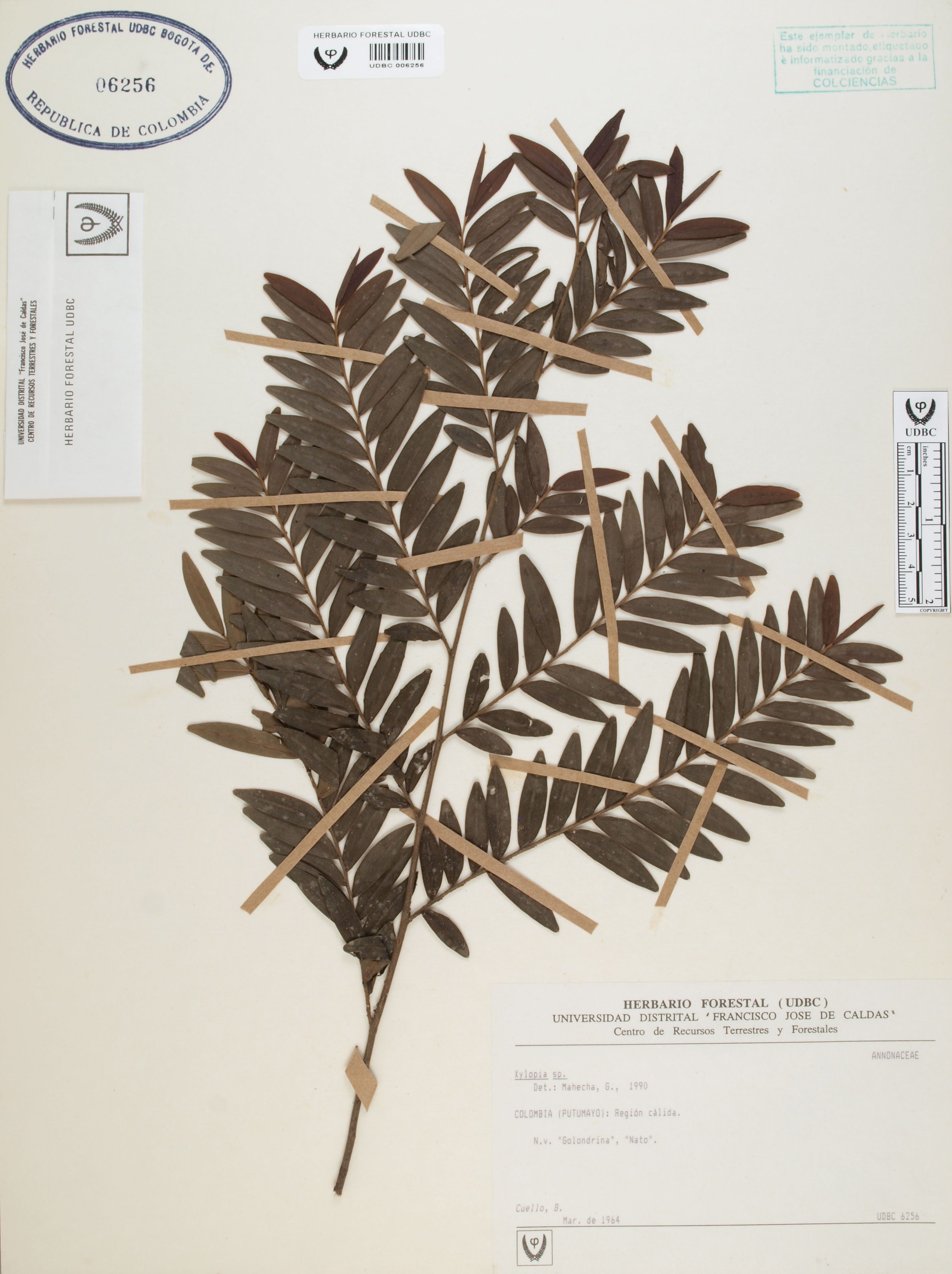 Fotografía del ejemplar Cuello, B., determinado como Xylopia sp. en el año 1990
