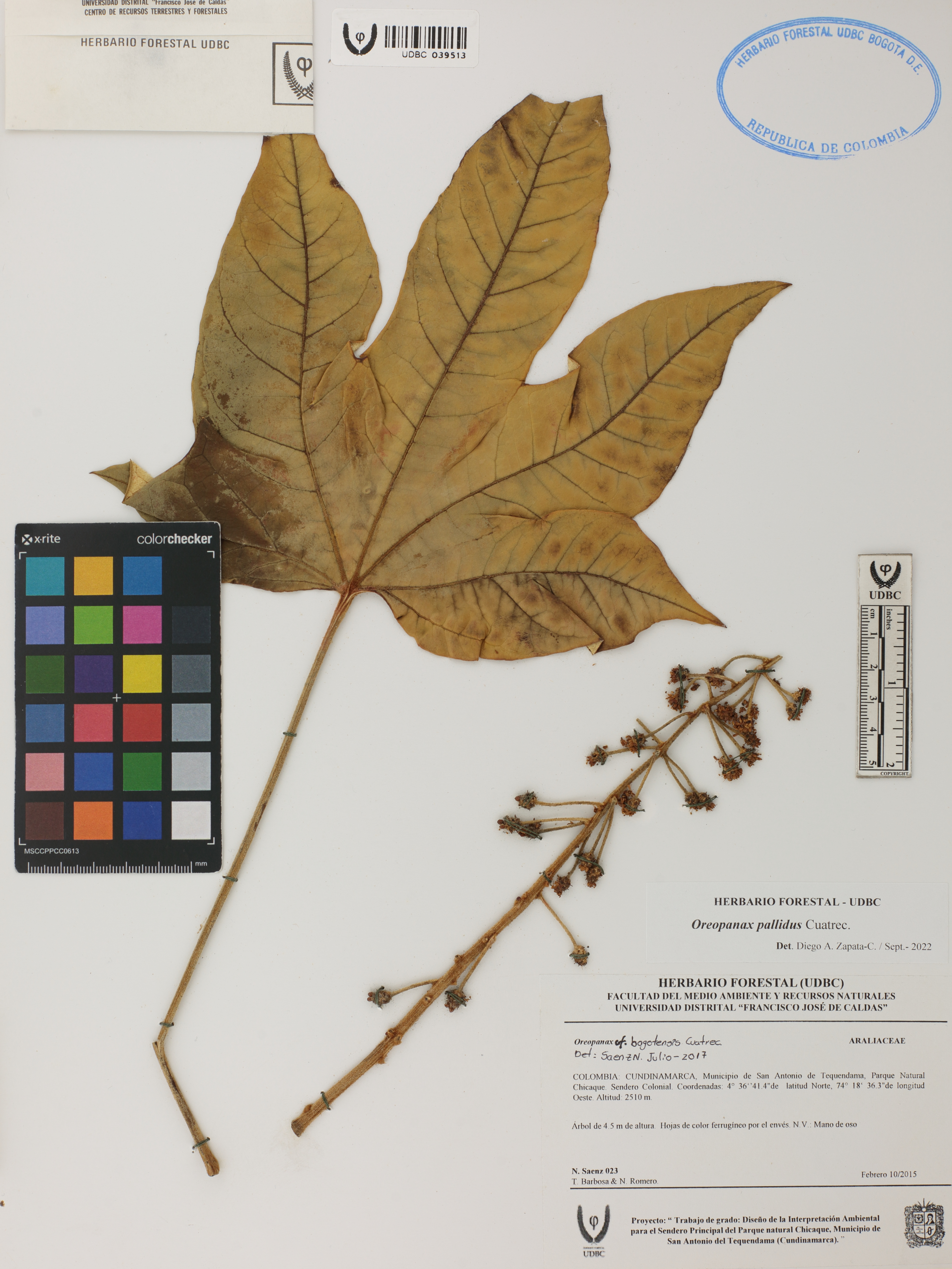 Fotografía del ejemplar Sáenz, N. 23, determinado como Oreopanax pallidus en el año 2022