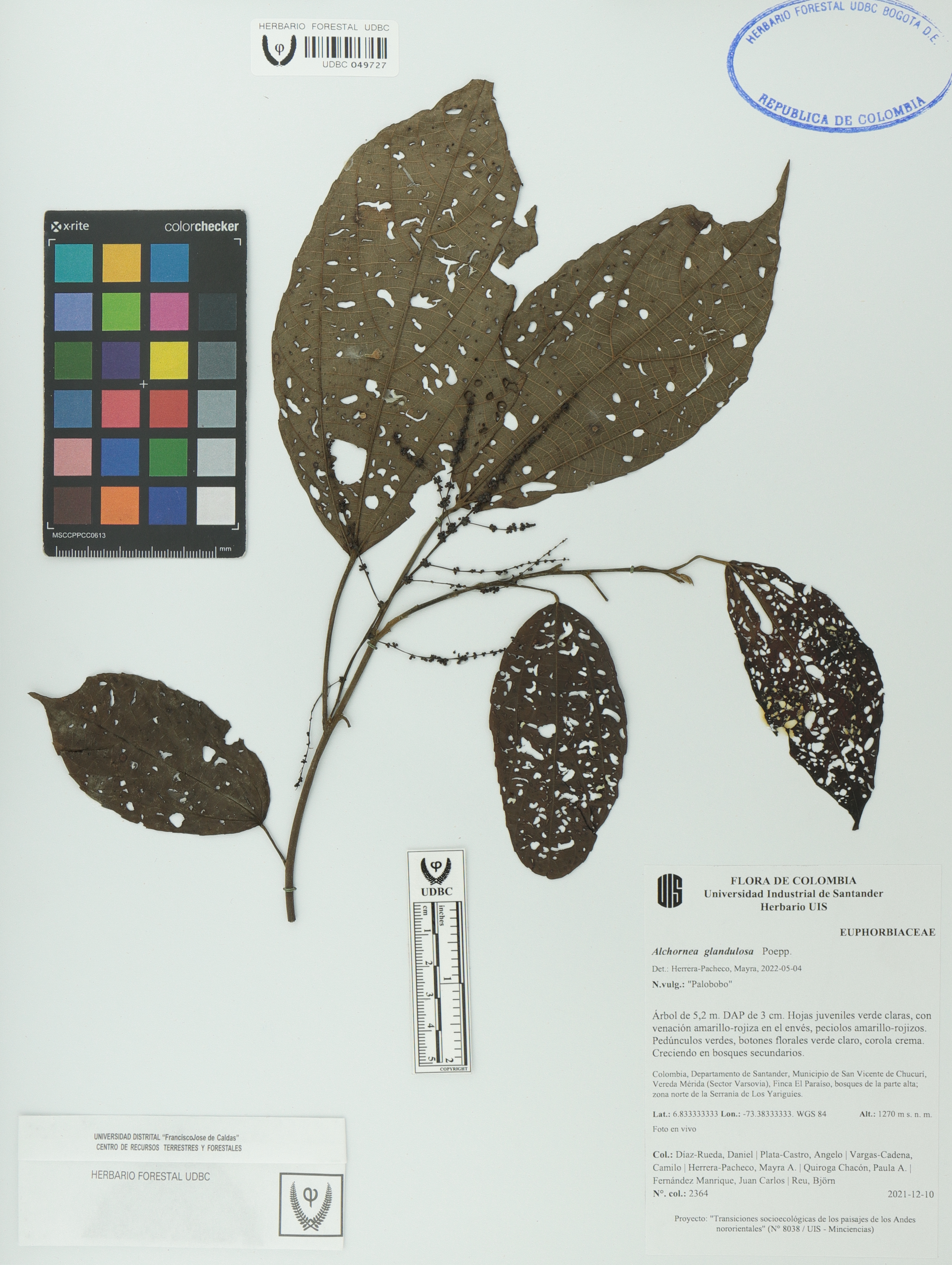 Fotografía del ejemplar Díaz-Rueda, D. 2364, determinado como Alchornea glandulosa en el año 2022