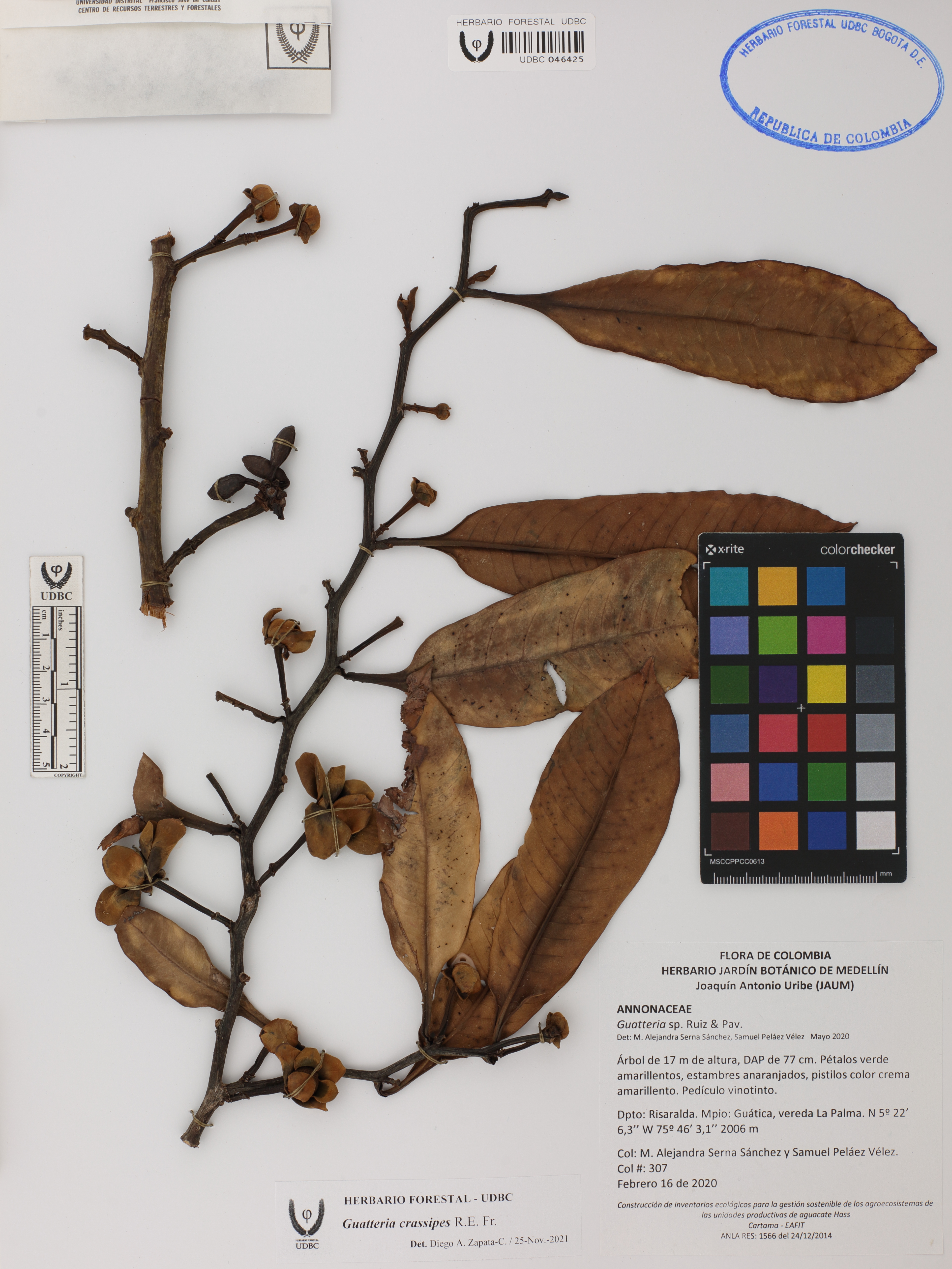 Fotografía del ejemplar Serna-Sánchez, M. 307, determinado como Guatteria crassipes en el año 2021