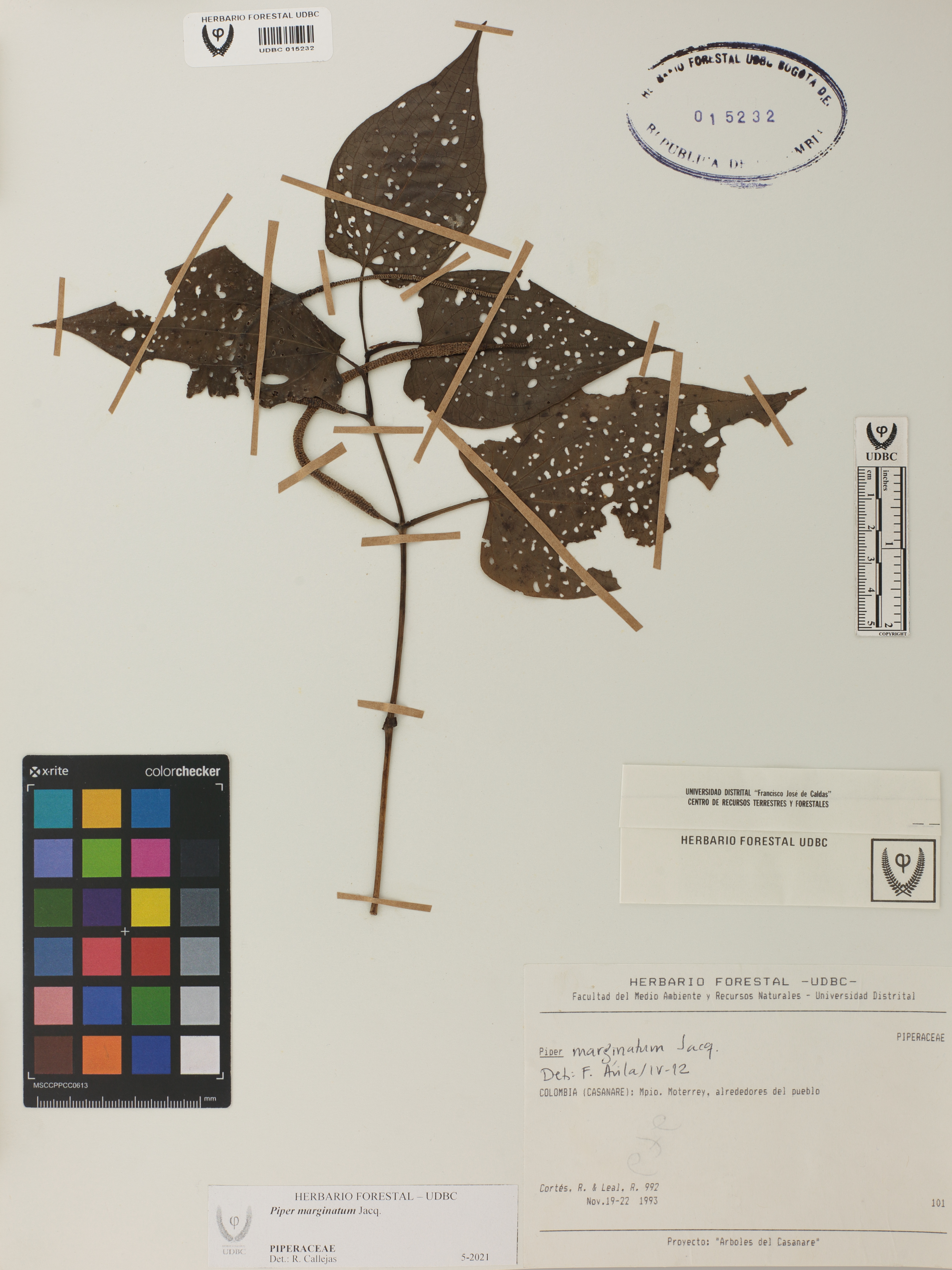 Fotografía del ejemplar Cortés, R. 992, determinado como Piper marginatum en el año 2021