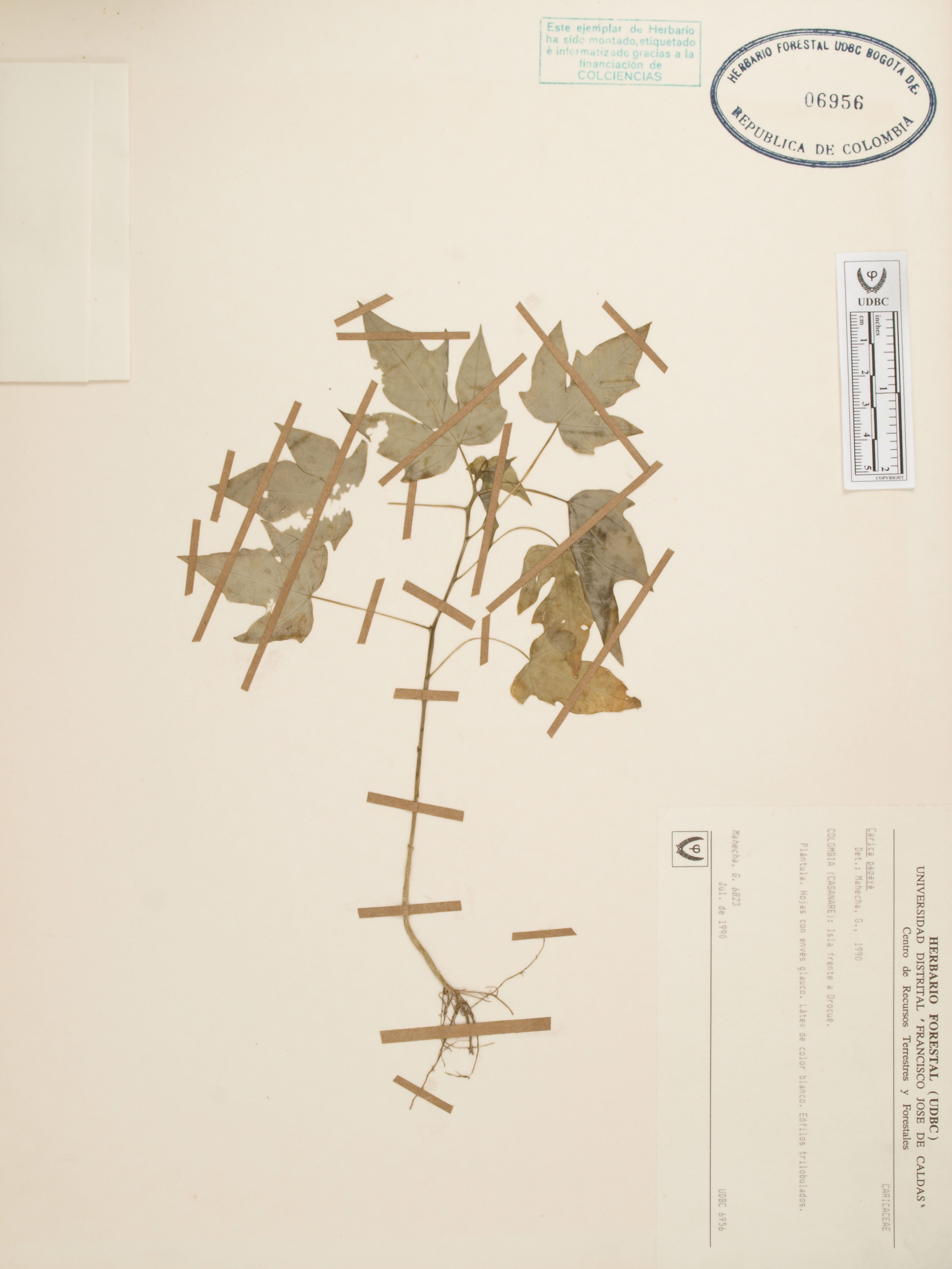 Fotografía del ejemplar Mahecha, G. 6823, determinado como Carica papaya en el año 1990