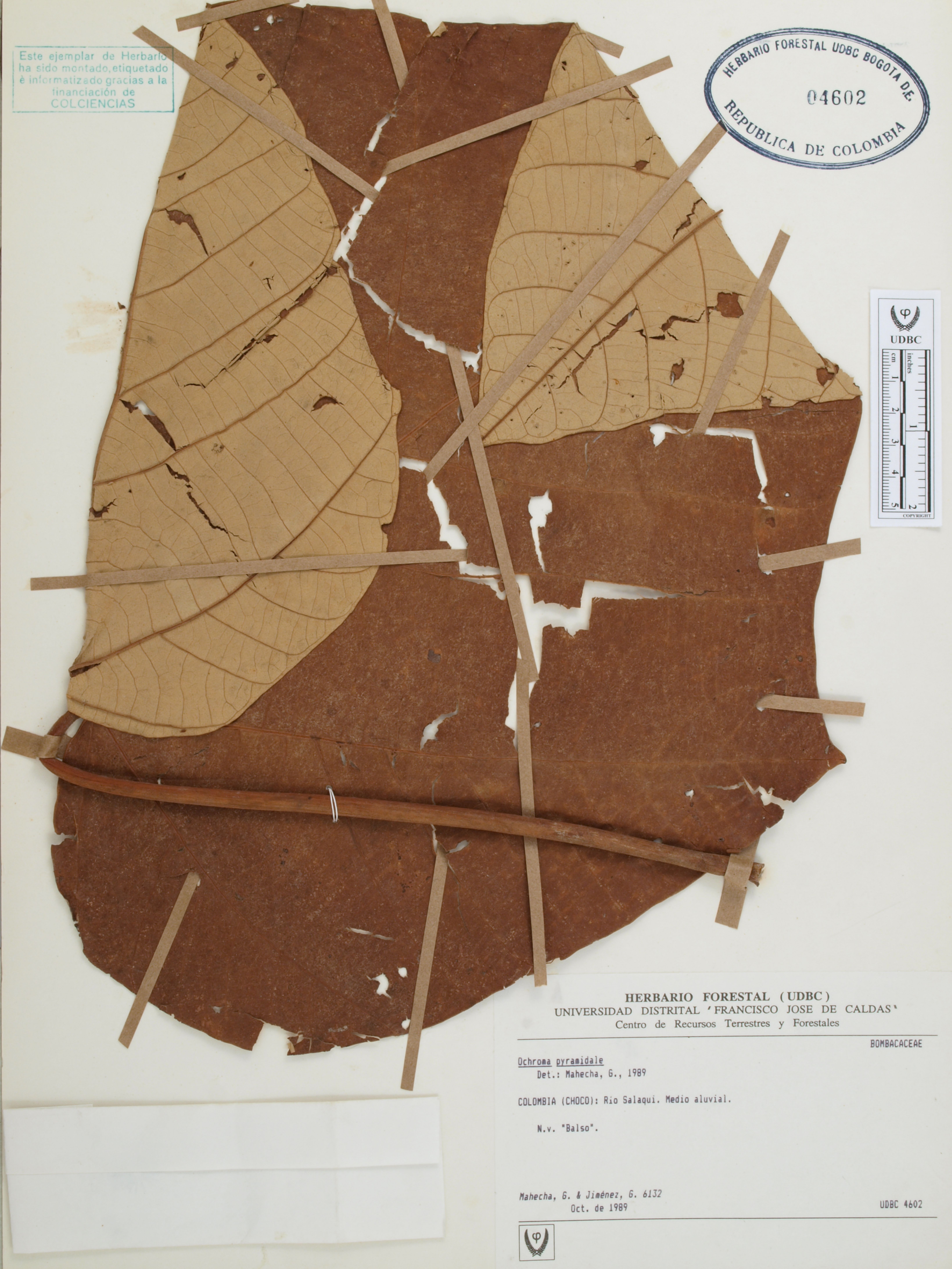 Fotografía del ejemplar Mahecha, G. 6132, determinado como Ochroma pyramidale en el año 1989