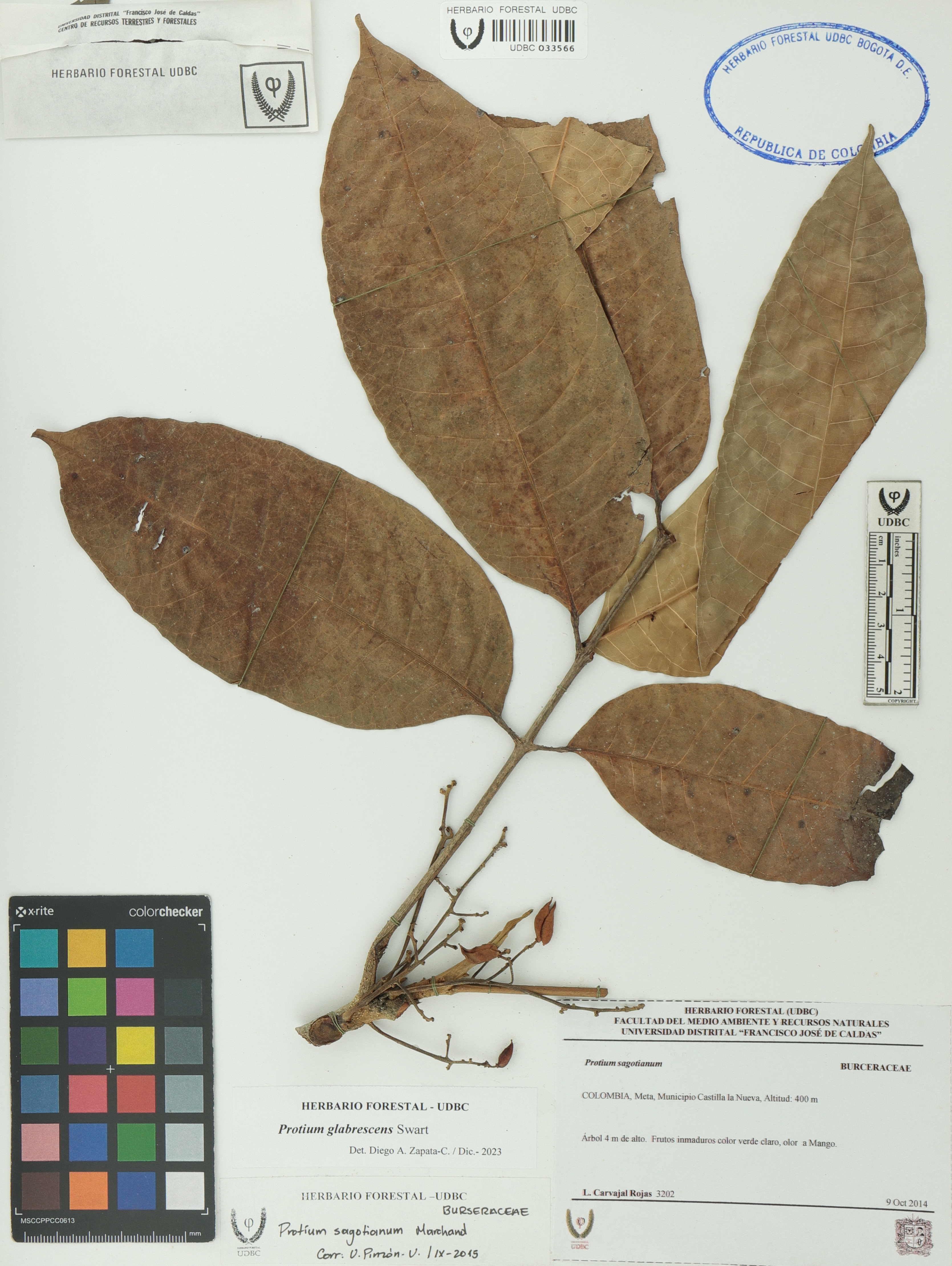 Fotografía del ejemplar Carvajal, L. 3202, determinado como Protium glabrescens en el año 2023