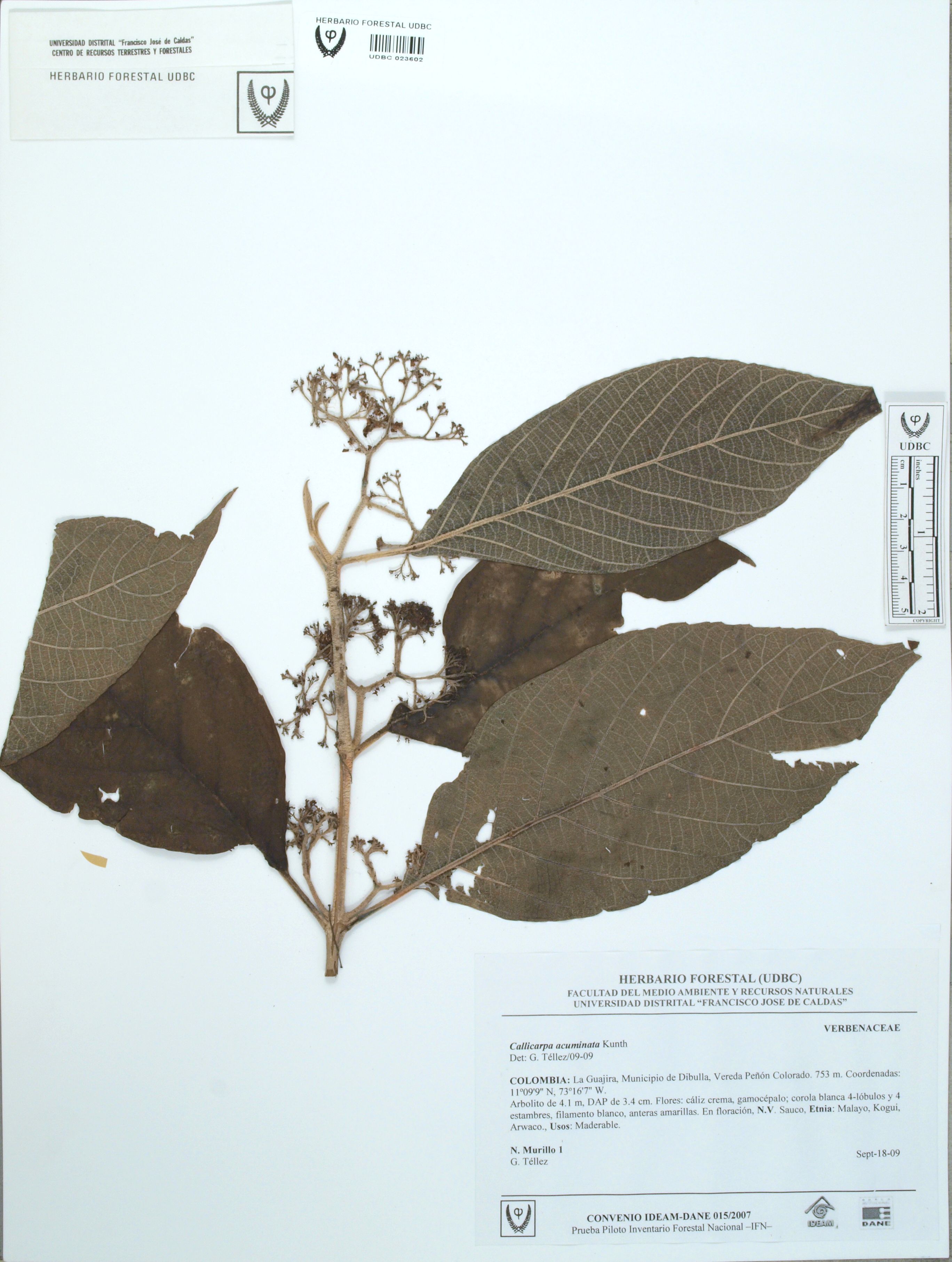 Fotografía del ejemplar Murillo, N. 1, determinado como Callicarpa acuminata en el año 2009