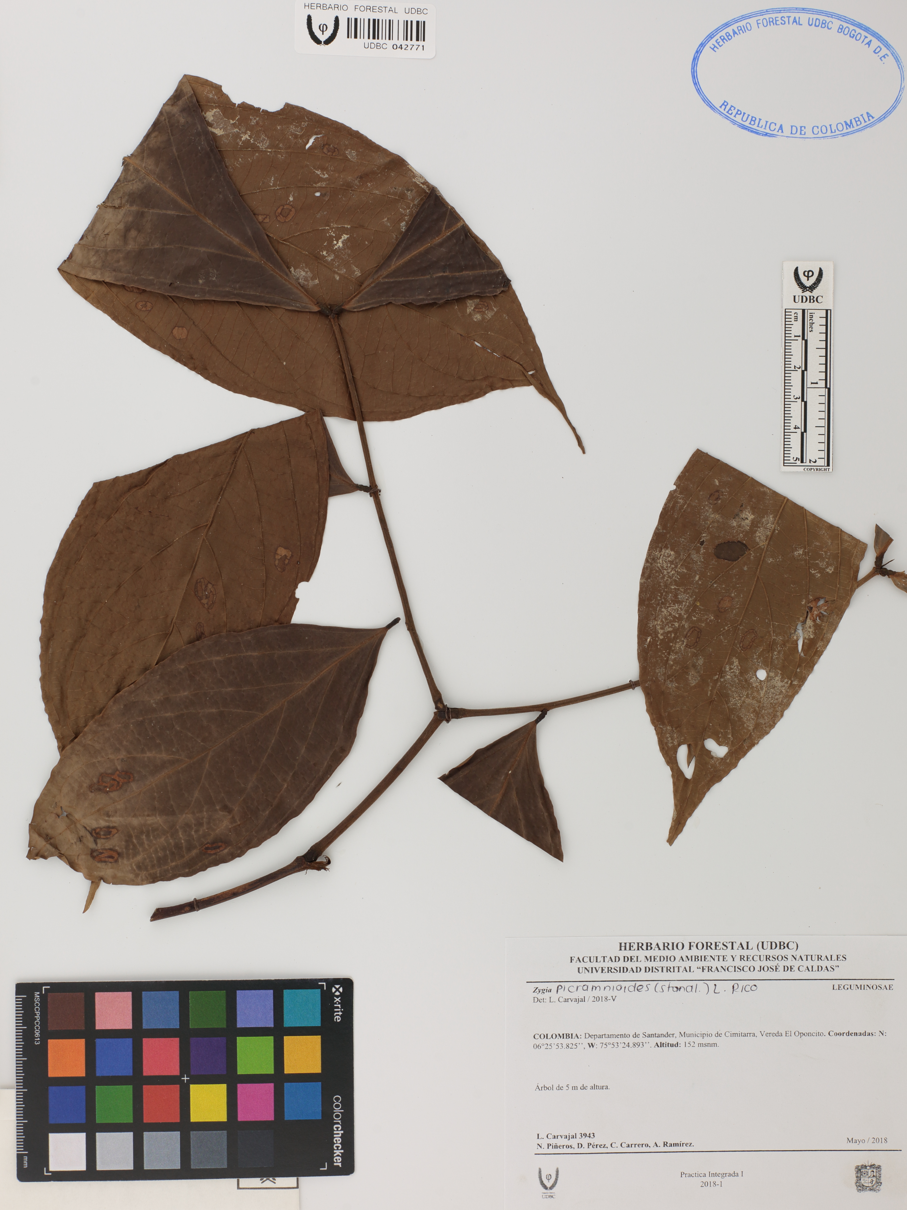Fotografía del ejemplar Carvajal, L. 3943, determinado como Zygia picramnioides en el año 2018