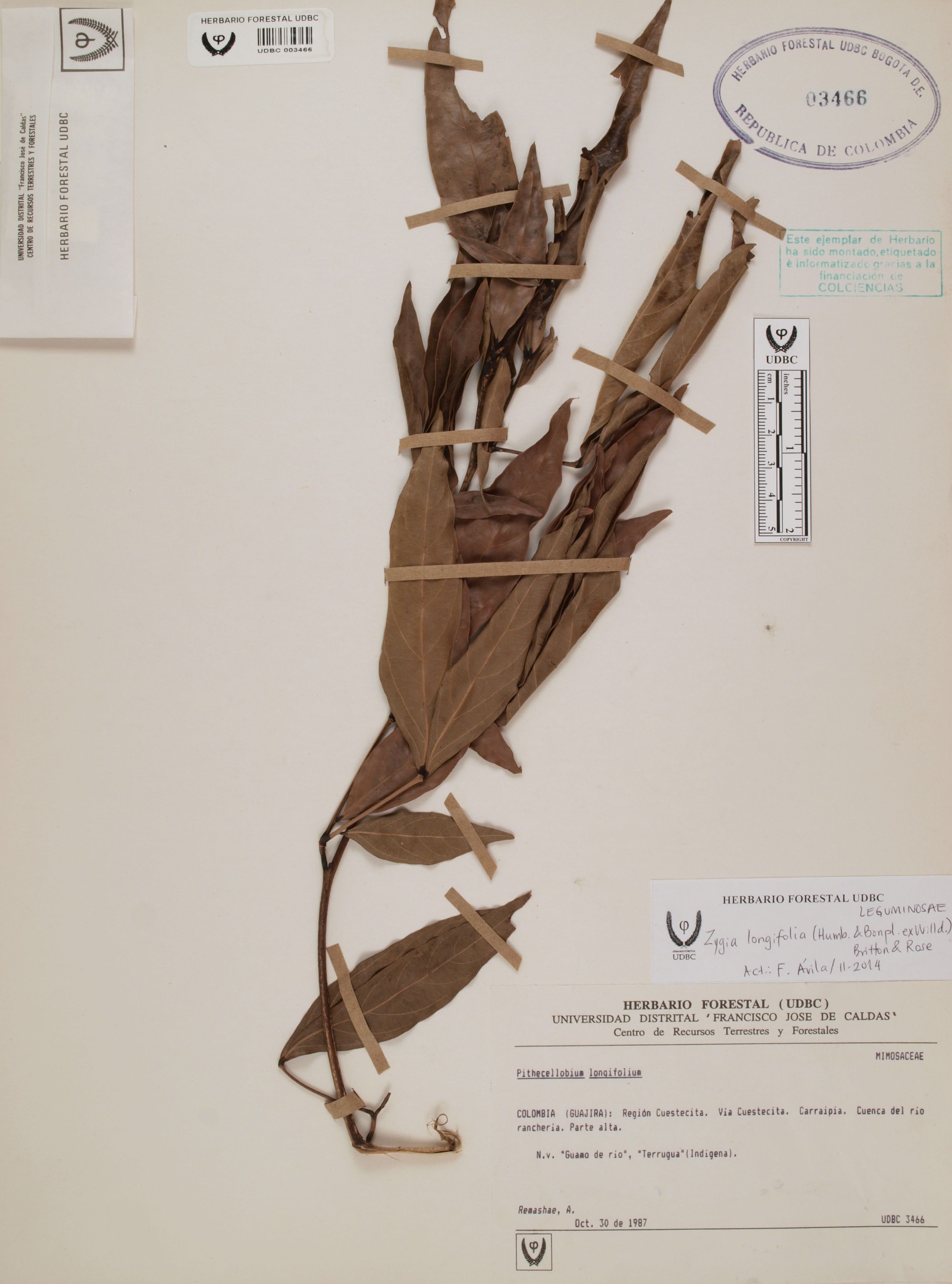 Fotografía del ejemplar Remashae, A., determinado como Zygia longifolia en el año 2014