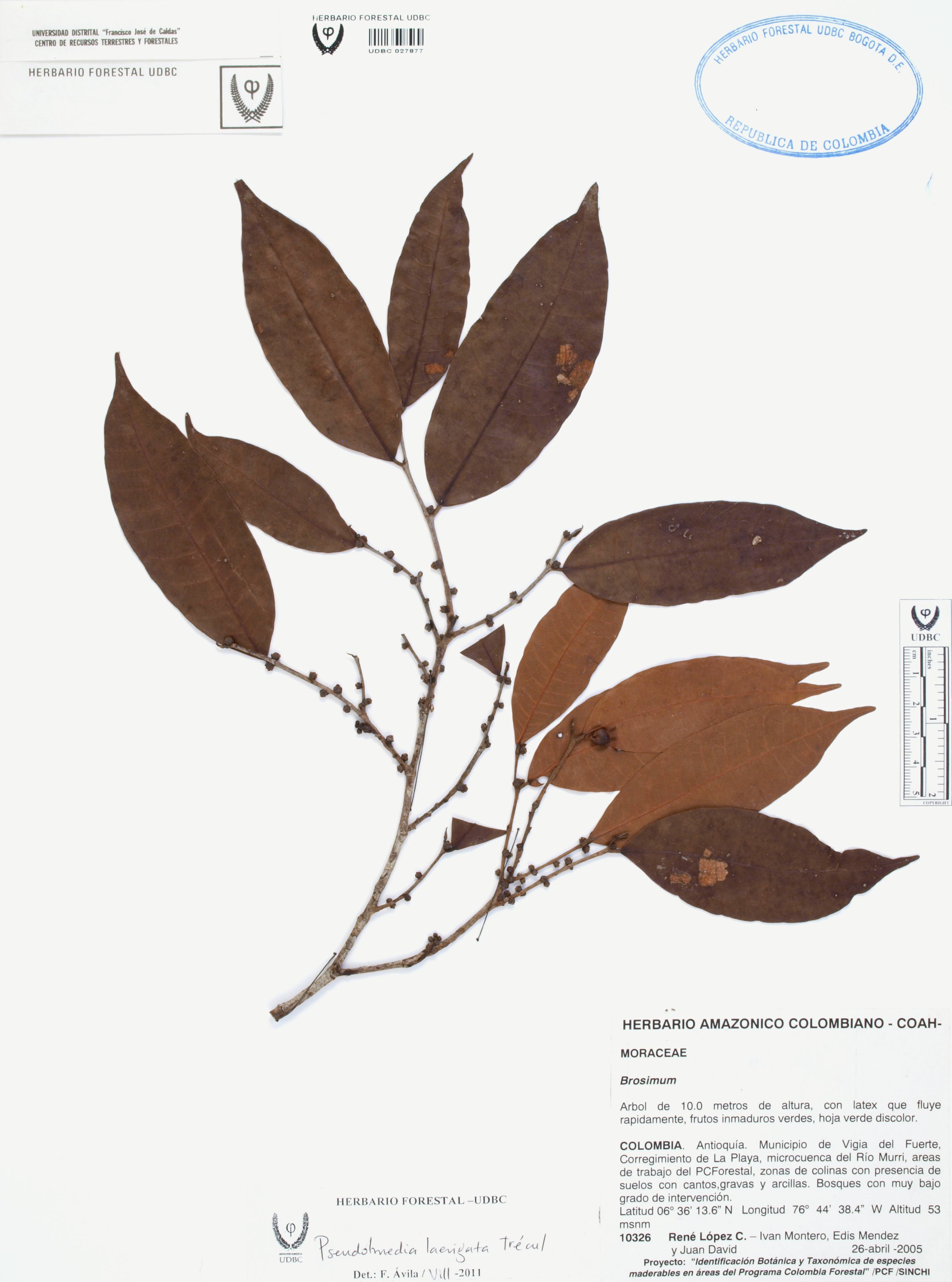 Fotografía del ejemplar López, R. 10326, determinado como Pseudolmedia laevigata en el año 2011