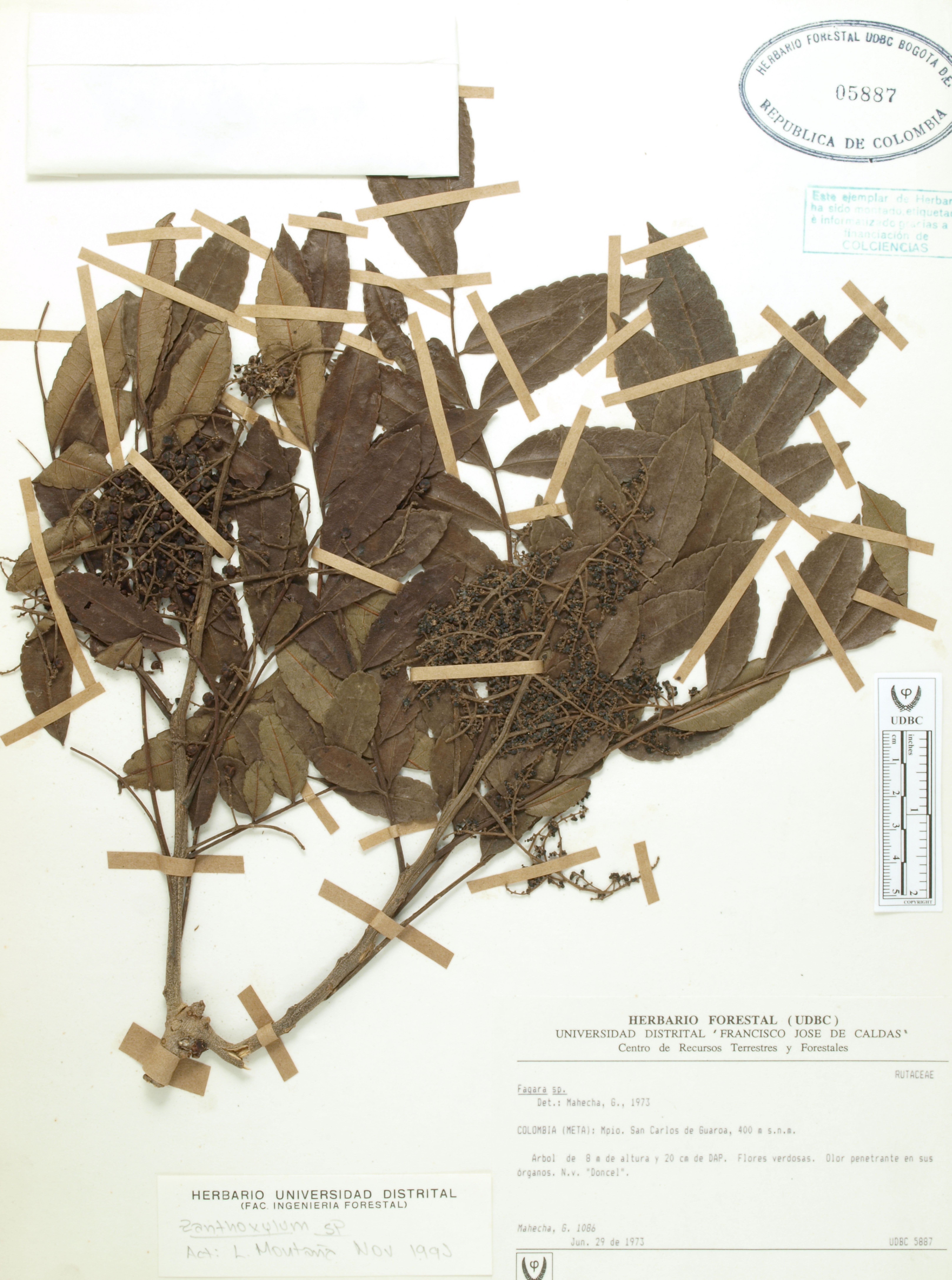 Fotografía del ejemplar Mahecha, G. 1086, determinado como Zanthoxylum rhoifolium en el año 2009