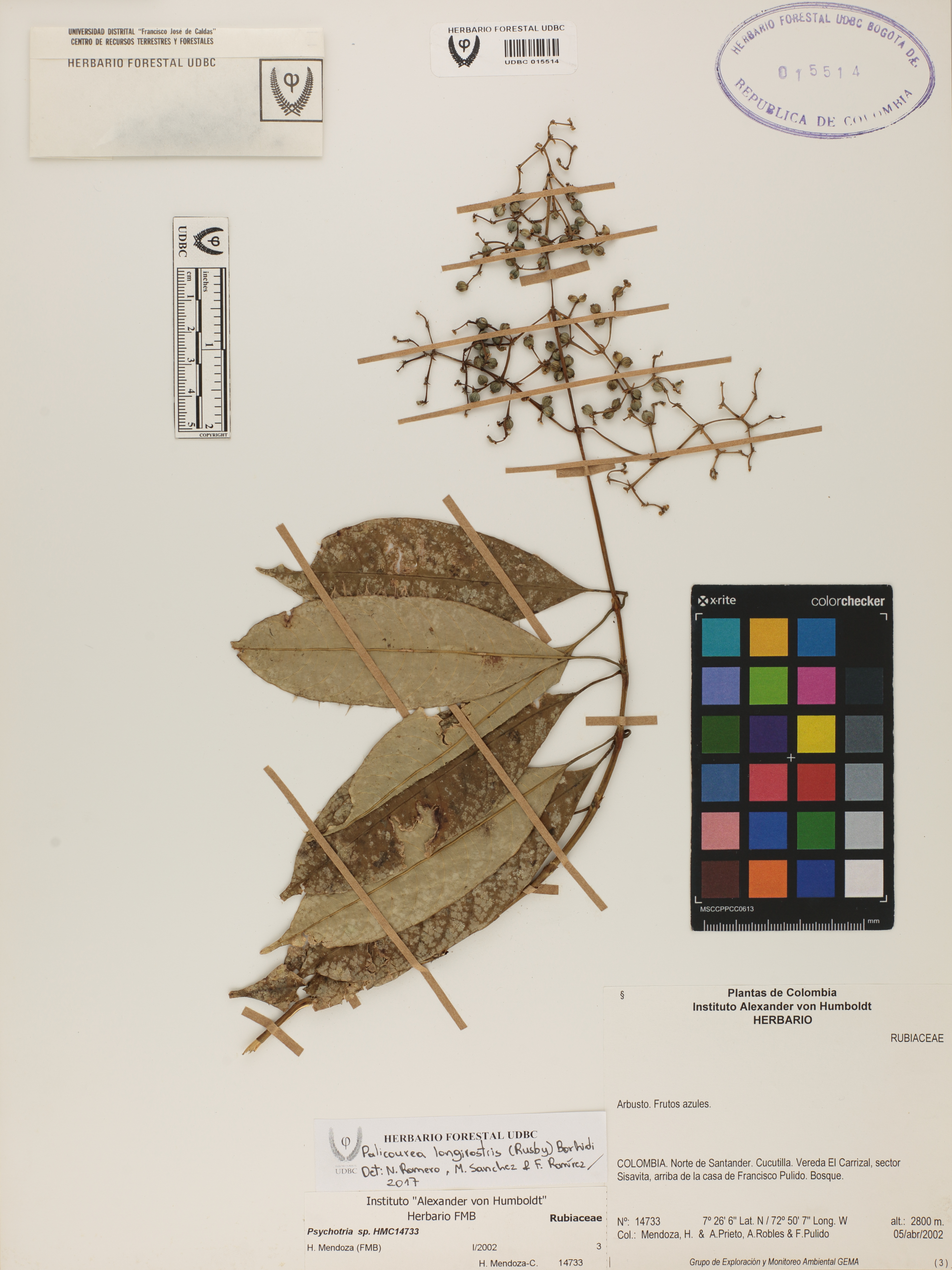 Fotografía del ejemplar Mendoza, H. 14733, determinado como Palicourea longirostris en el año 2017