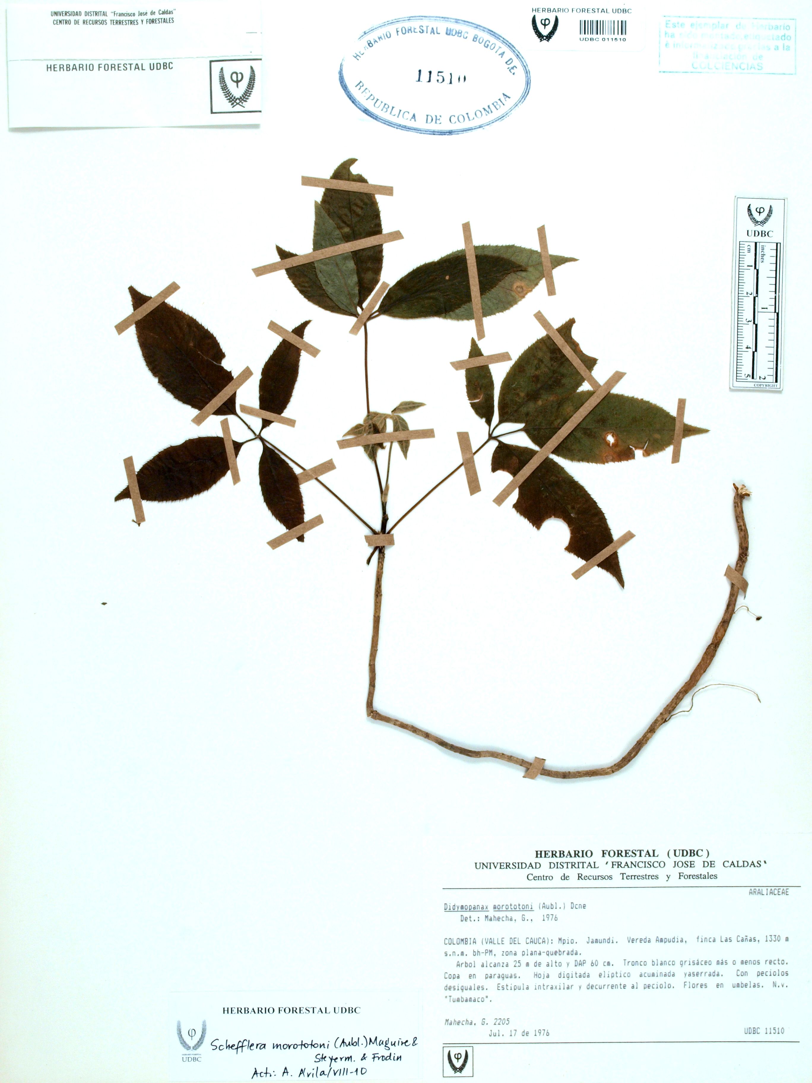 Fotografía del ejemplar Mahecha, G. 2205, determinado como Didymopanax morototoni en el año 2010