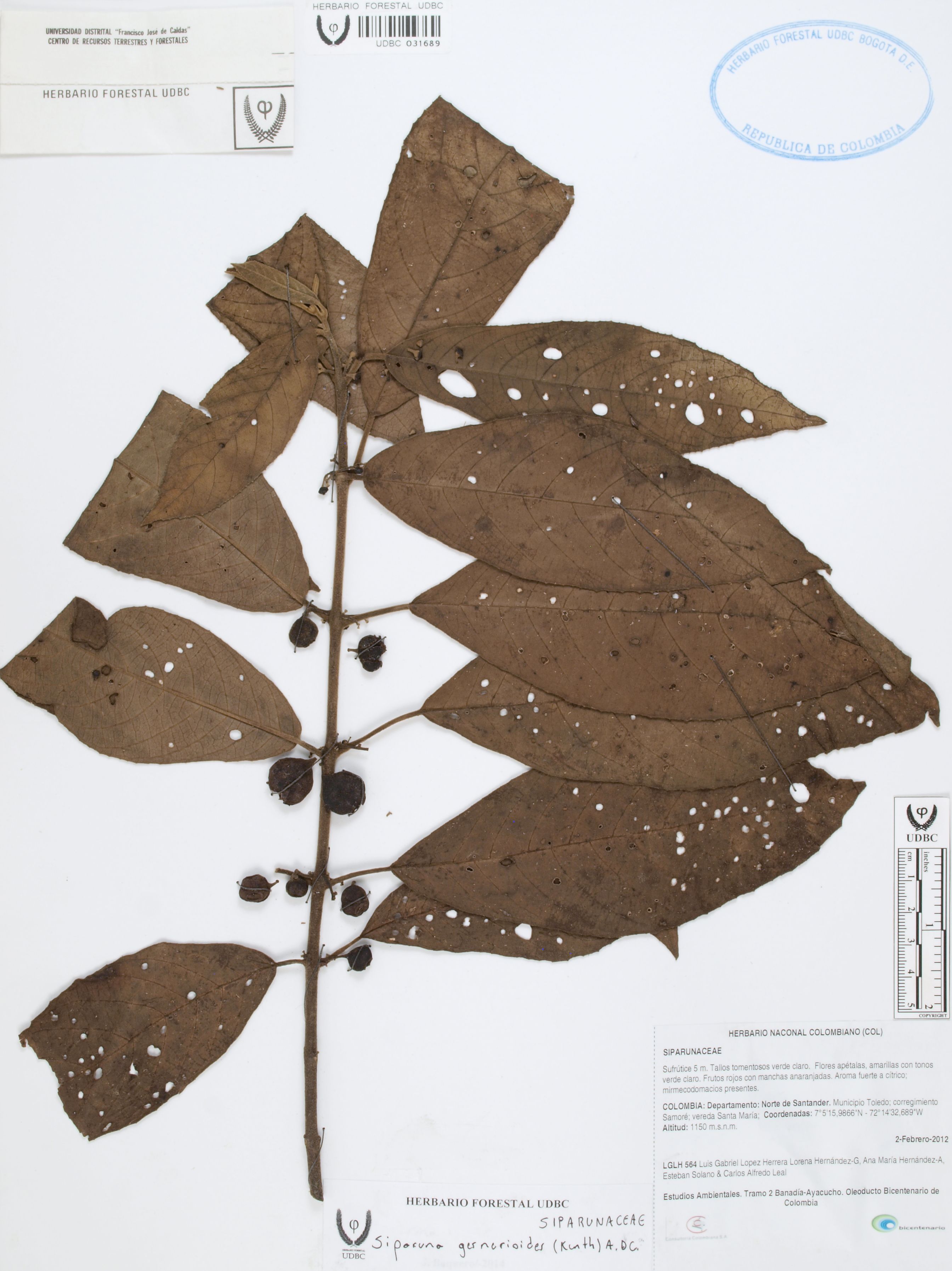 Fotografía del ejemplar López, L. 564, determinado como Siparuna gesnerioides