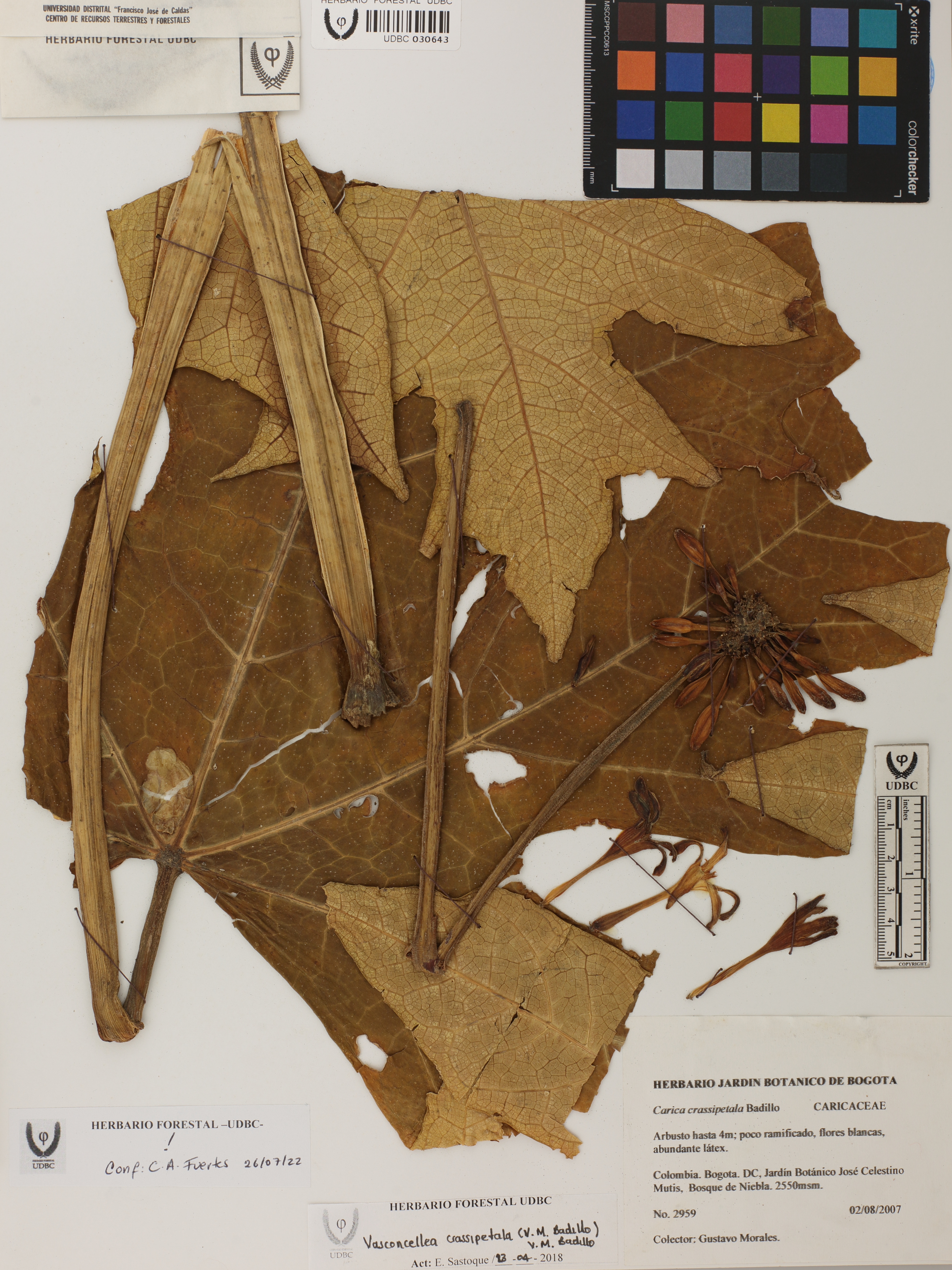 Fotografía del ejemplar Morales, G. 2959, determinado como Vasconcellea crassipetala en el año 2007