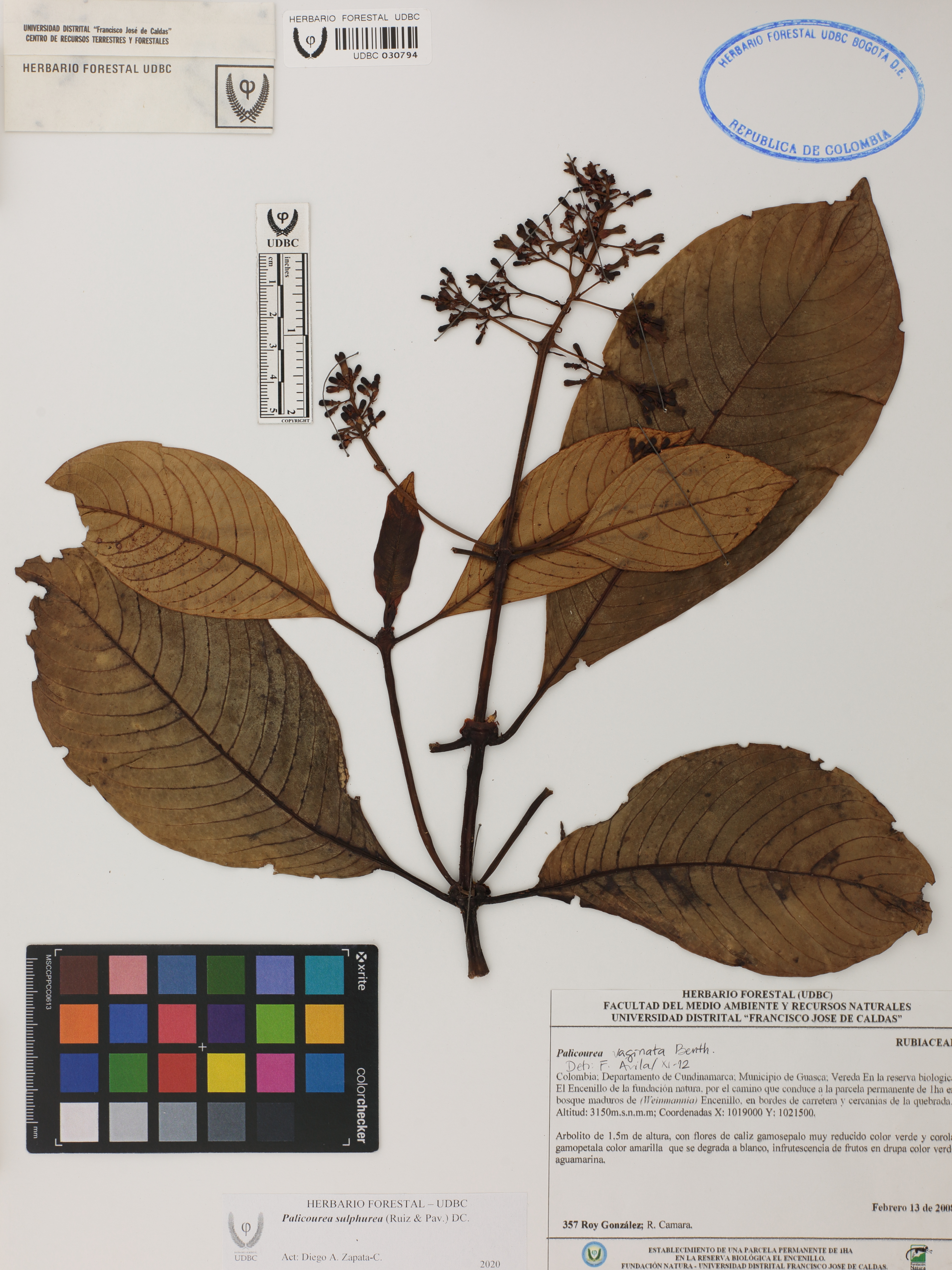 Fotografía del ejemplar González, R. 357, determinado como Palicourea sulphurea en el año 2012