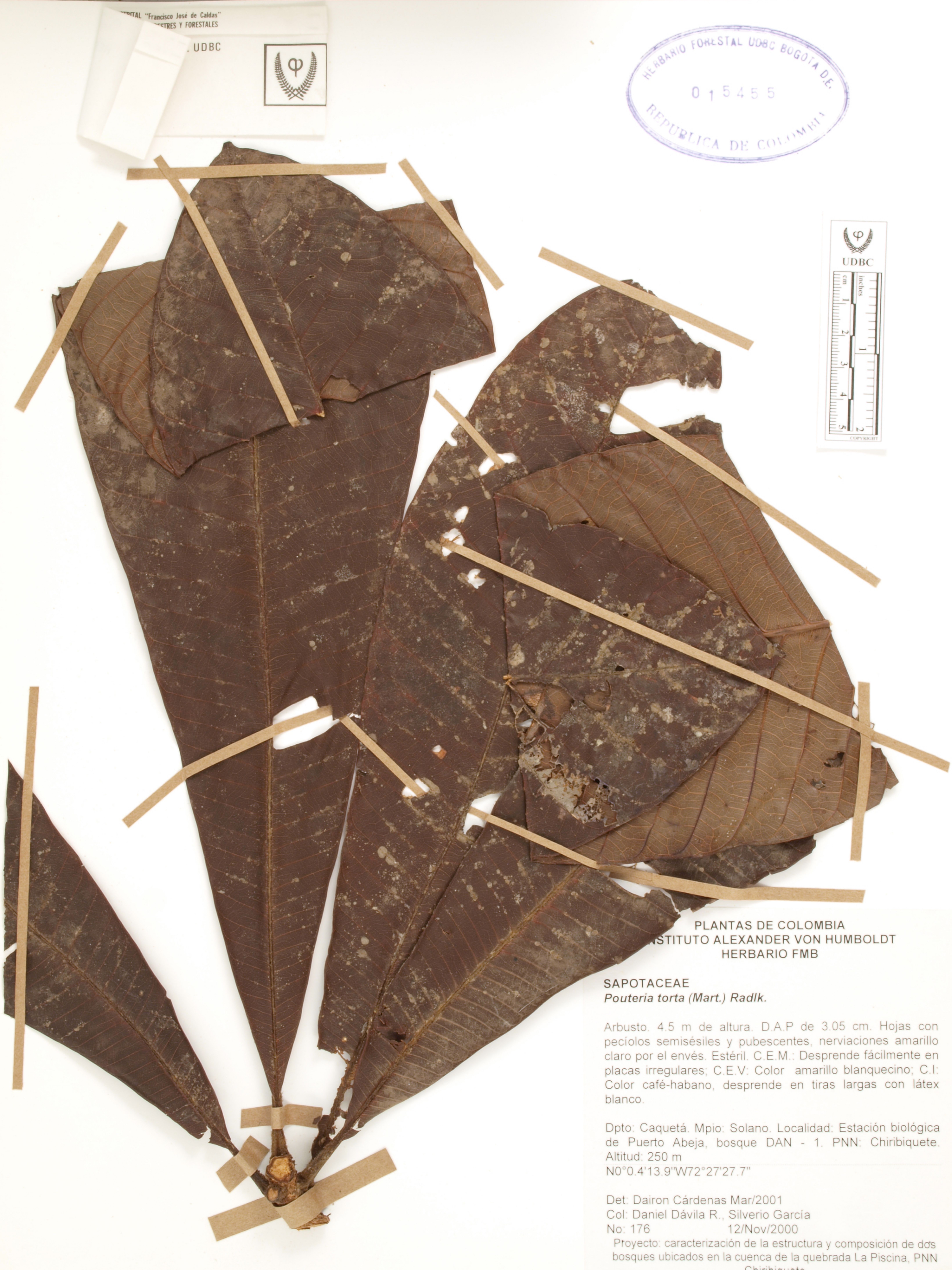 Fotografía del ejemplar Dávila, D. 176, determinado como Pouteria torta en el año 2001