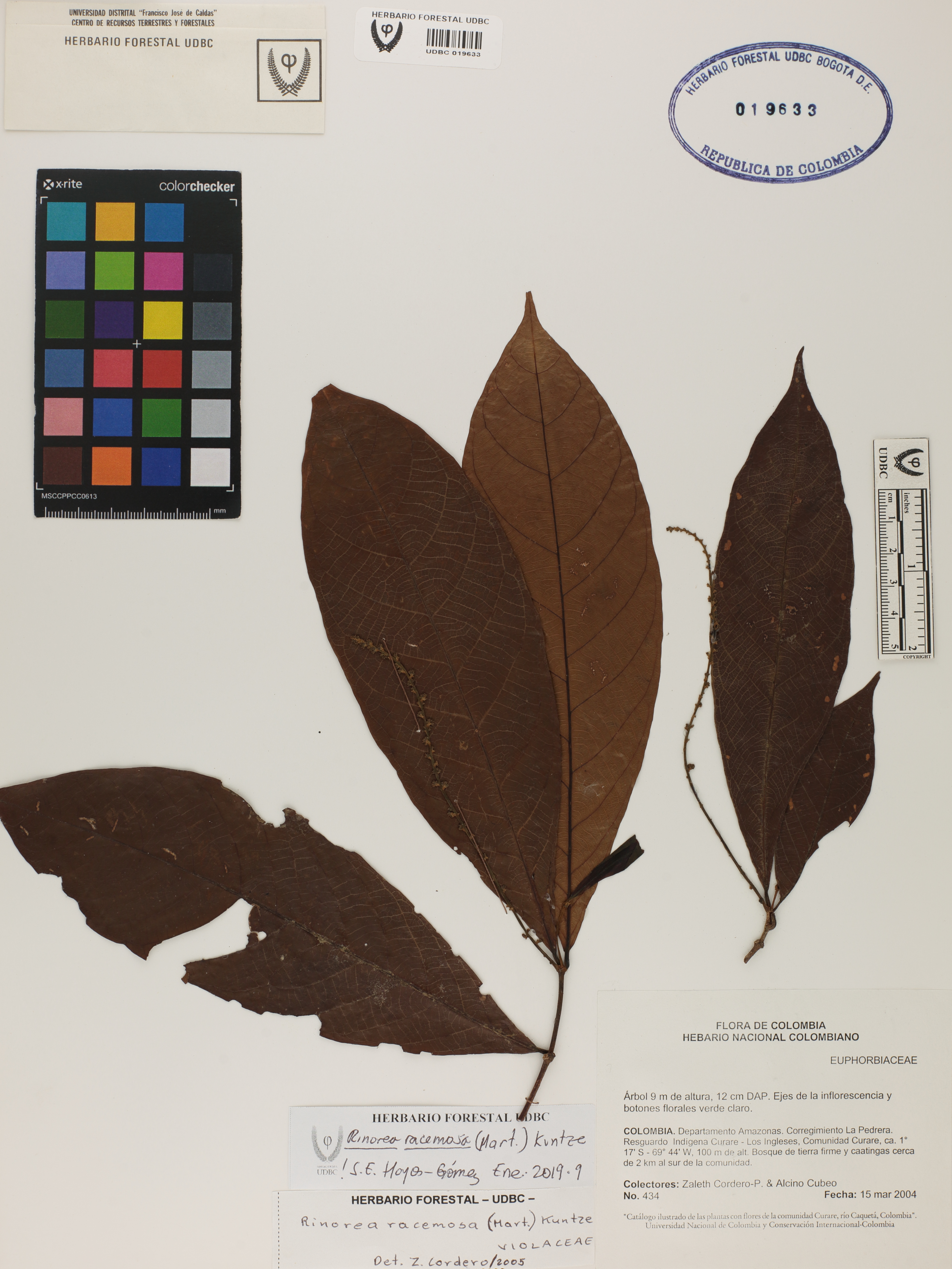 Fotografía del ejemplar Cordero, Z. 434, determinado como Rinorea racemosa en el año 2019