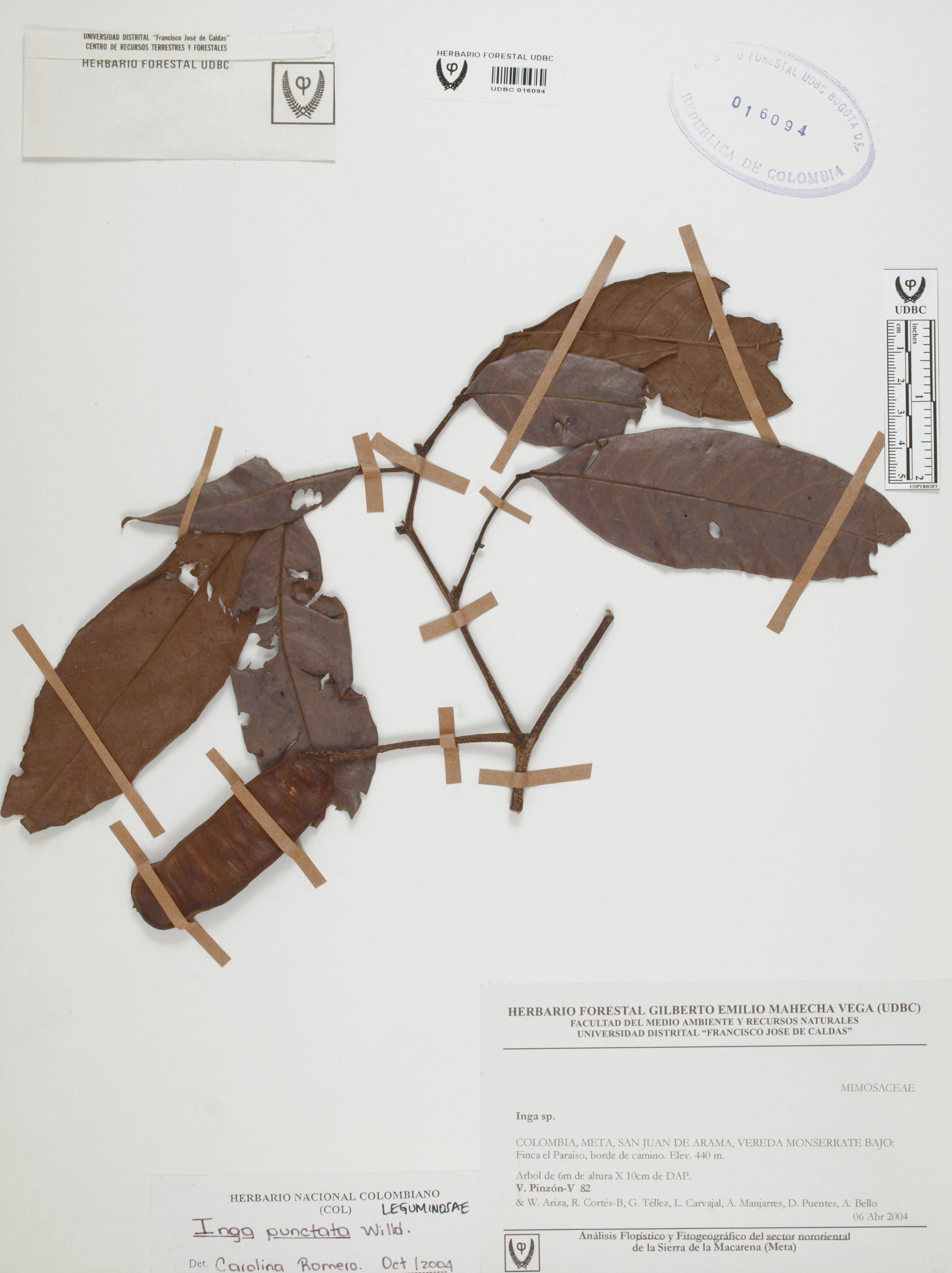 Fotografía del ejemplar Pinzón, V. 82, determinado como Inga punctata en el año 2004