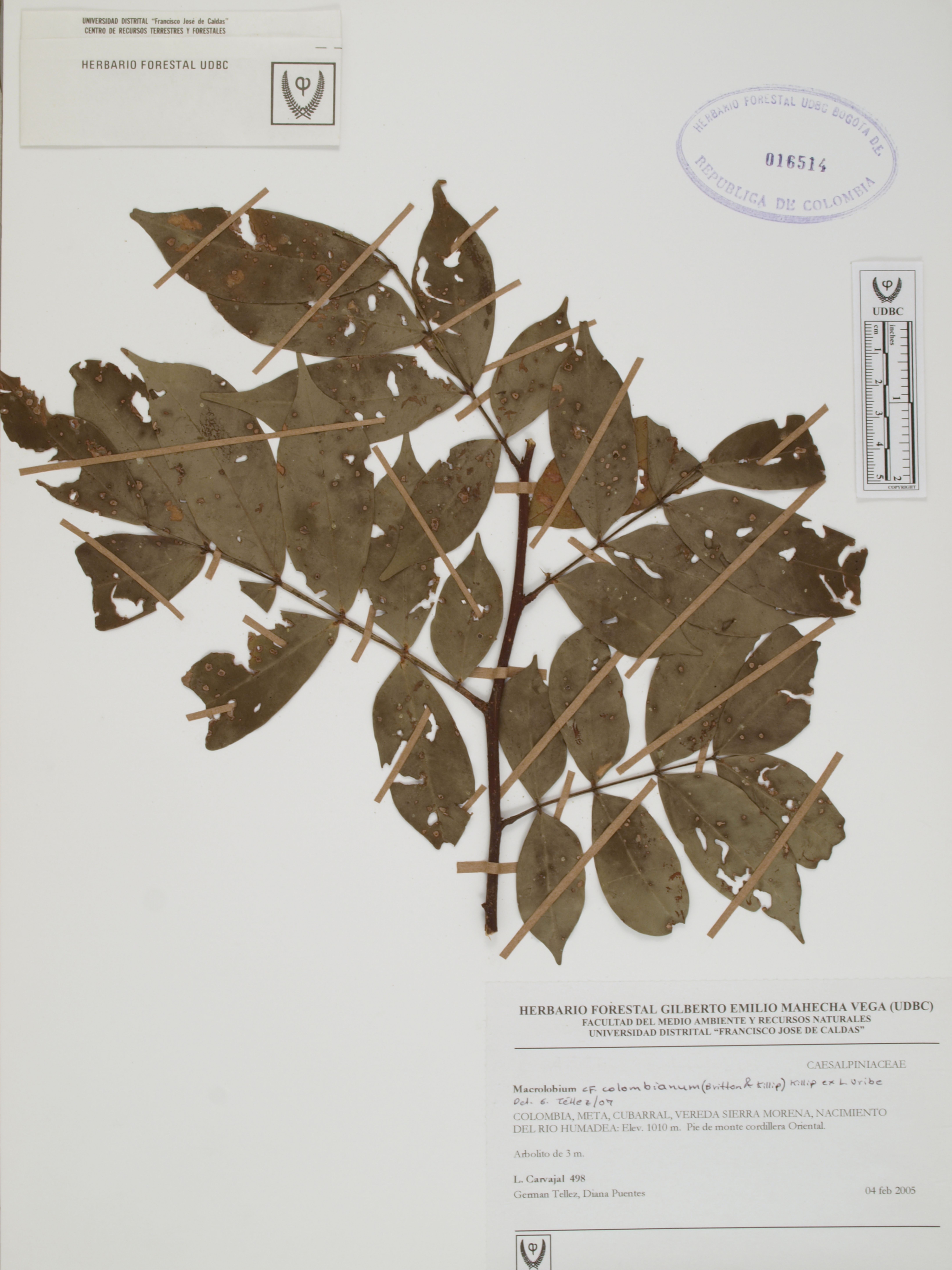 | dc.description | Fotografía del ejemplar Carvajal, L. 498, determinado como Macrolobium colombianum en el año 2007 | |