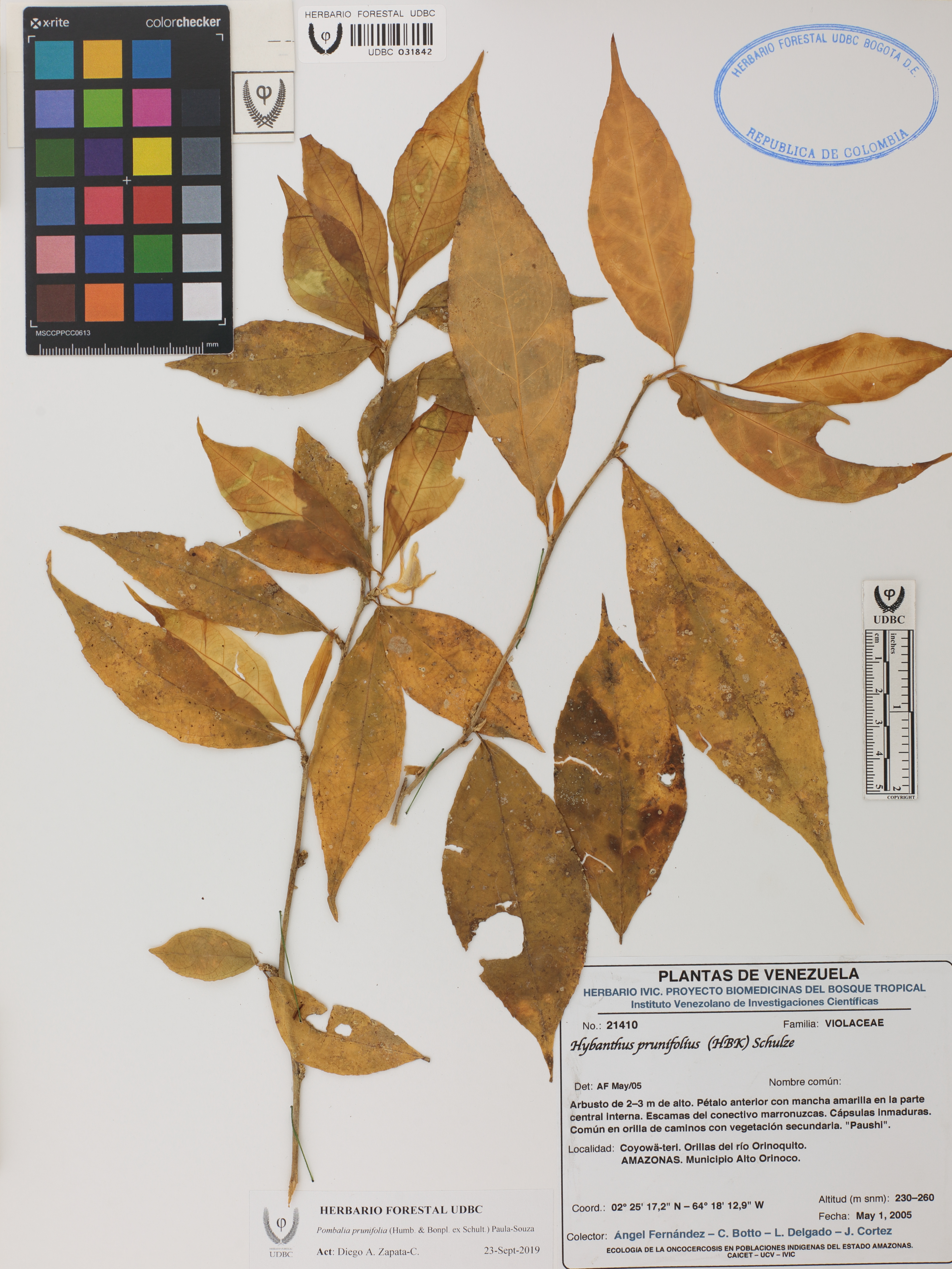 Fotografía del ejemplar Fernández, A. 21410, determinado como Pombalia prunifolia en el año 2005