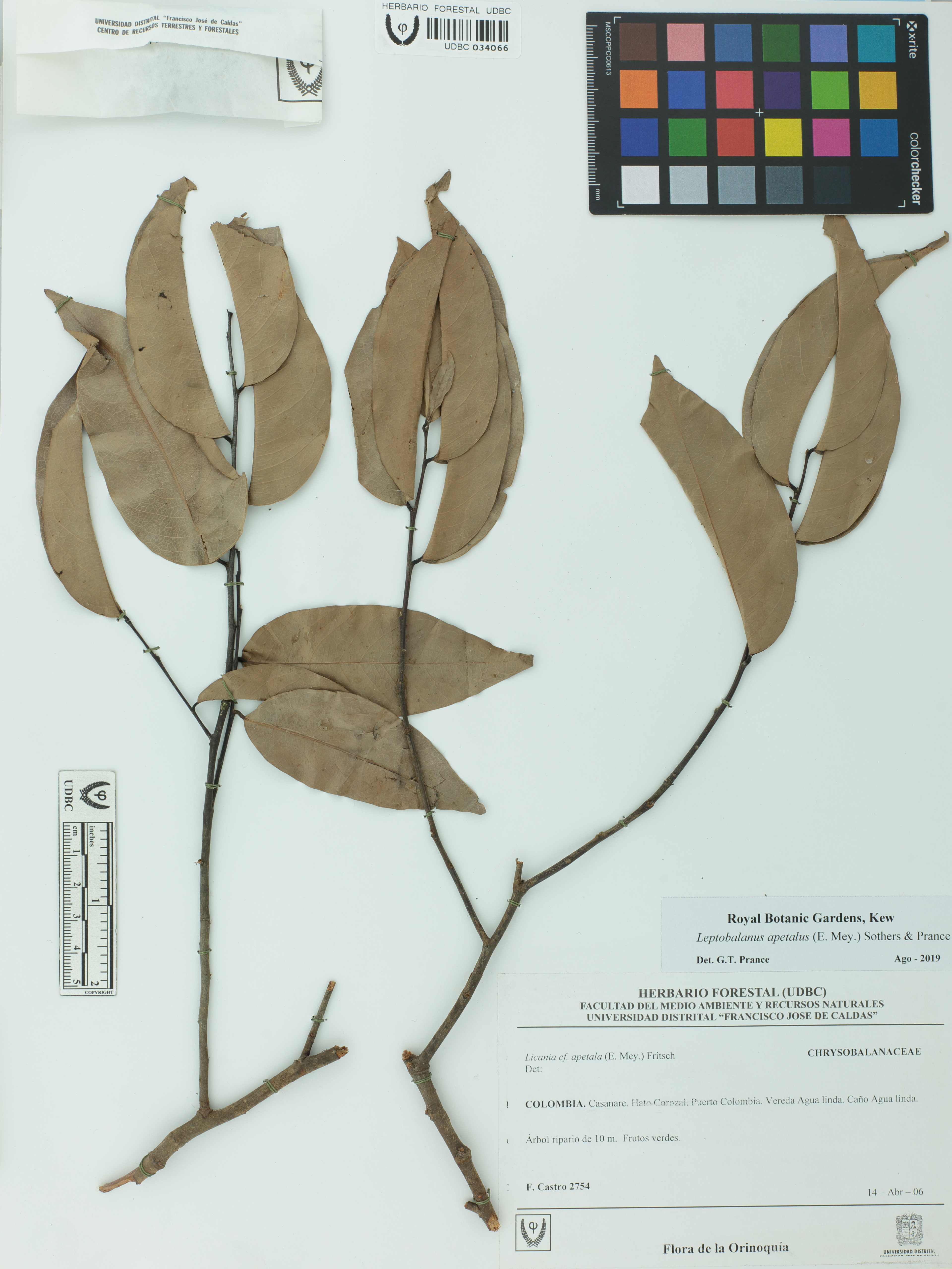 Fotografía del ejemplar Castro, F. 2754, determinado como Leptobalanus apetalus en el año 2019