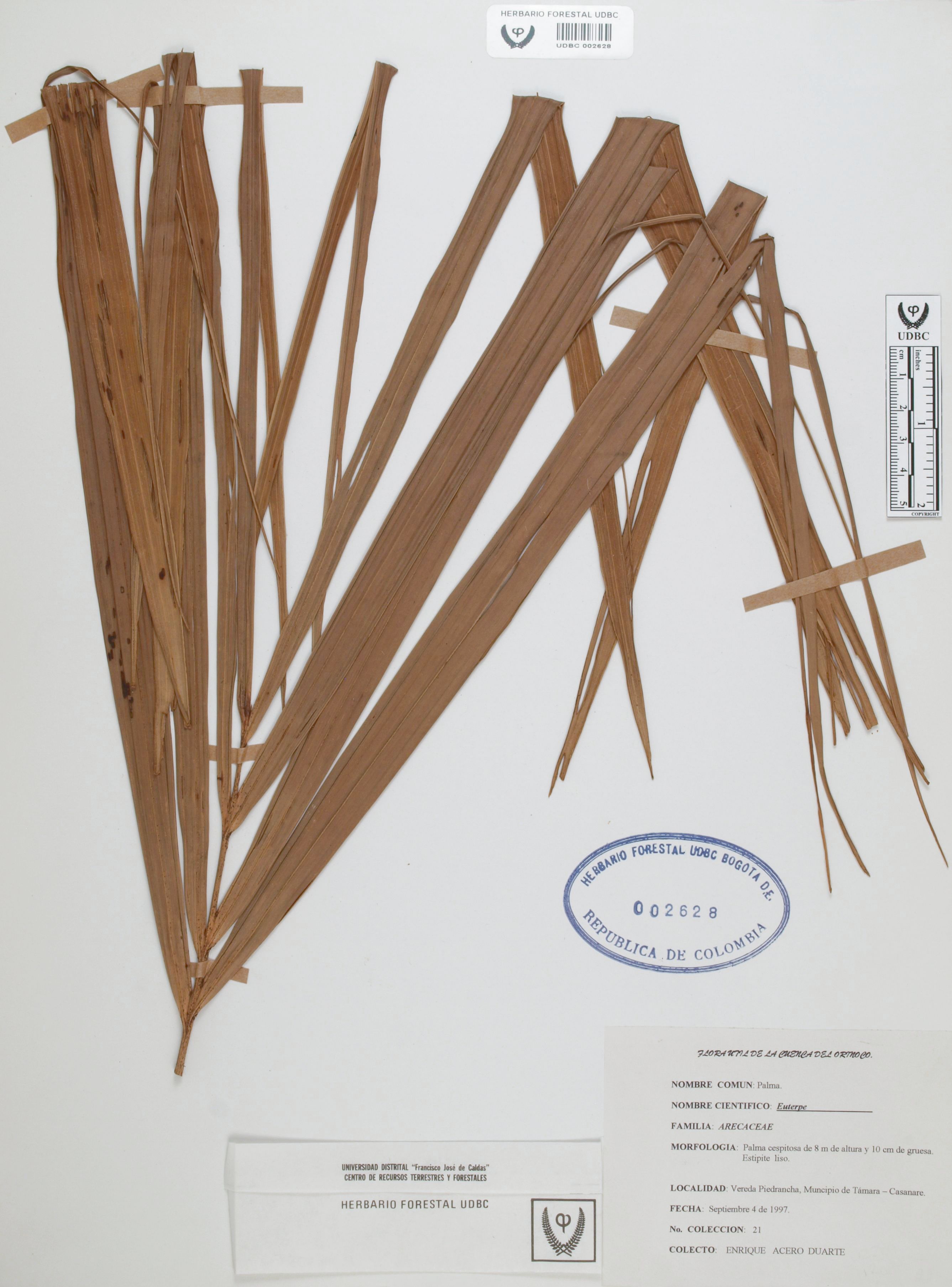 Fotografía del ejemplar Acero, E. 21, determinado como Euterpe sp.