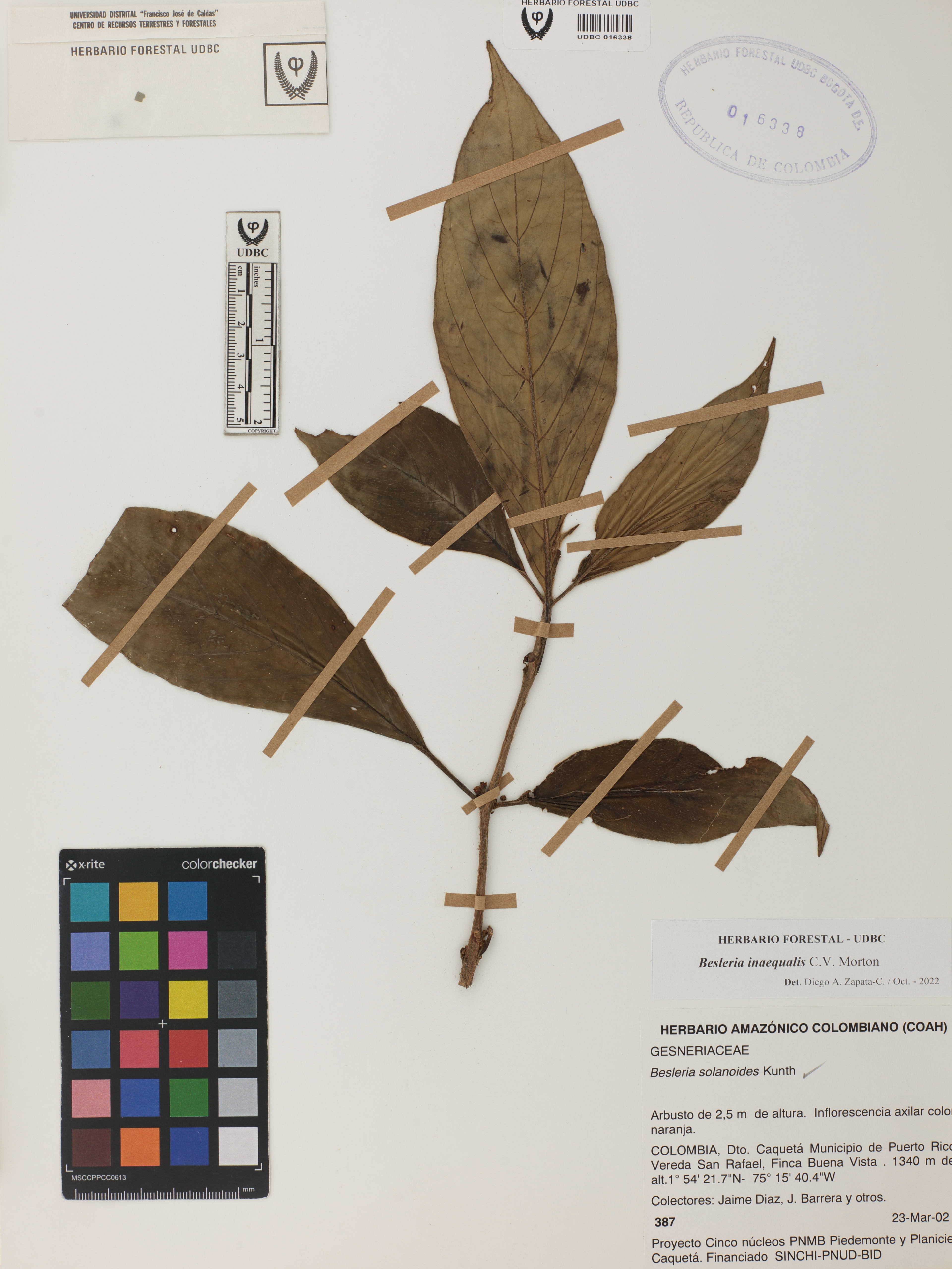 Fotografía del ejemplar Díaz, J. 387, determinado como Besleria inaequalis en el año 2022
