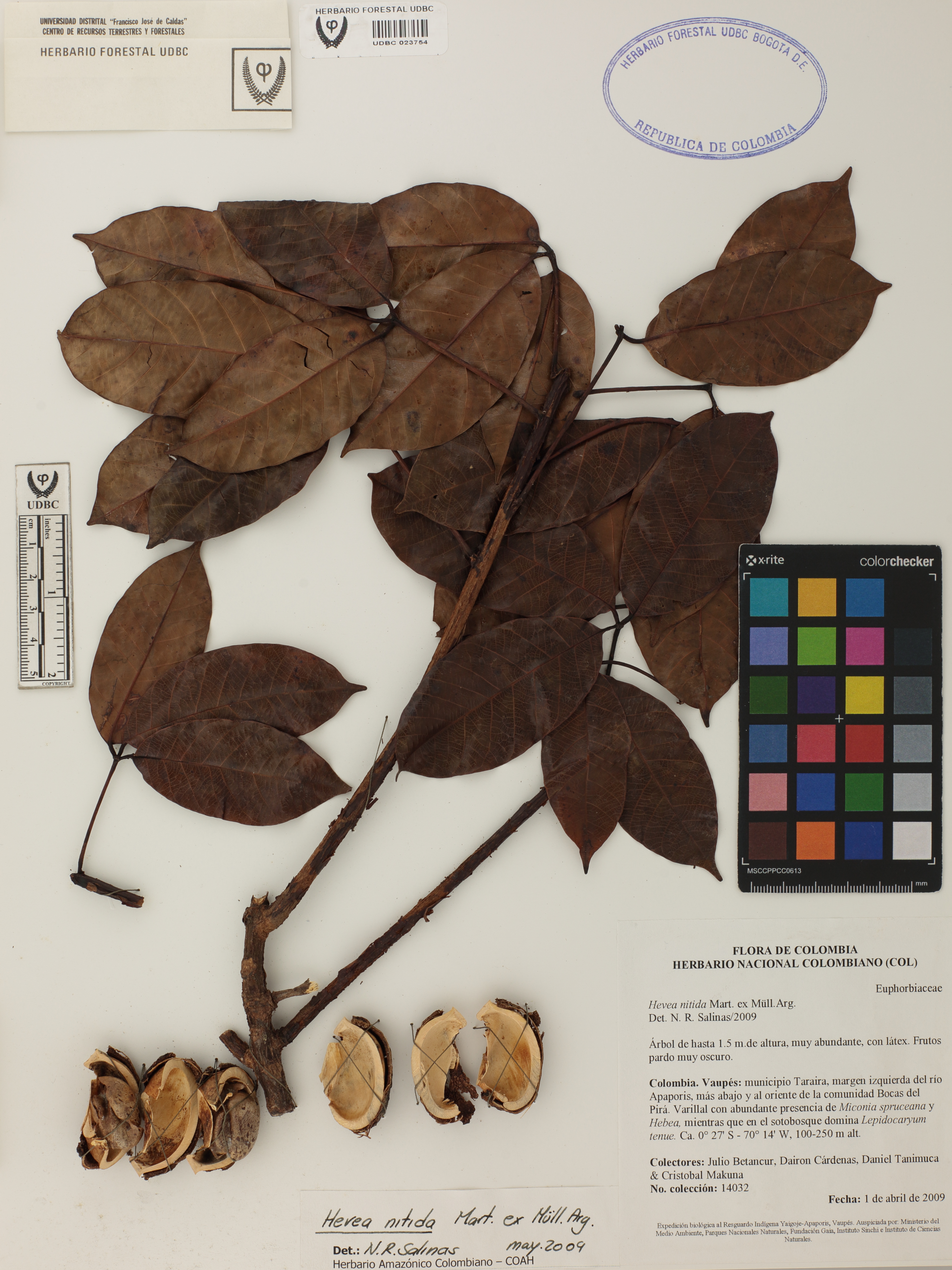 | dc.description | Fotografía del ejemplar Betancur, J. 14032, determinado como Hevea nitida en el año 2009 | |