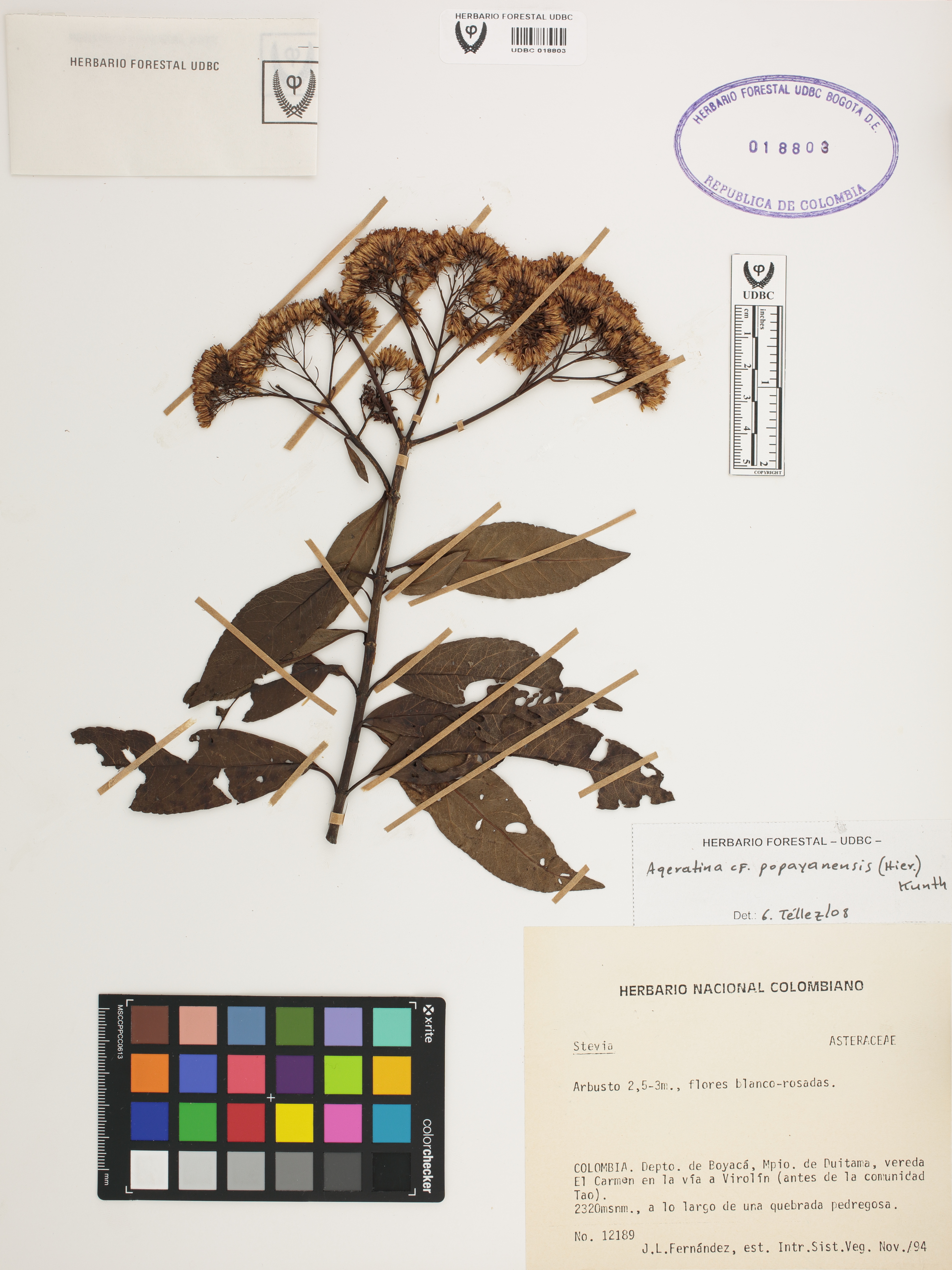 Fotografía del ejemplar Fernández, J. 12189, determinado como Ageratina popayanensis en el año 2008