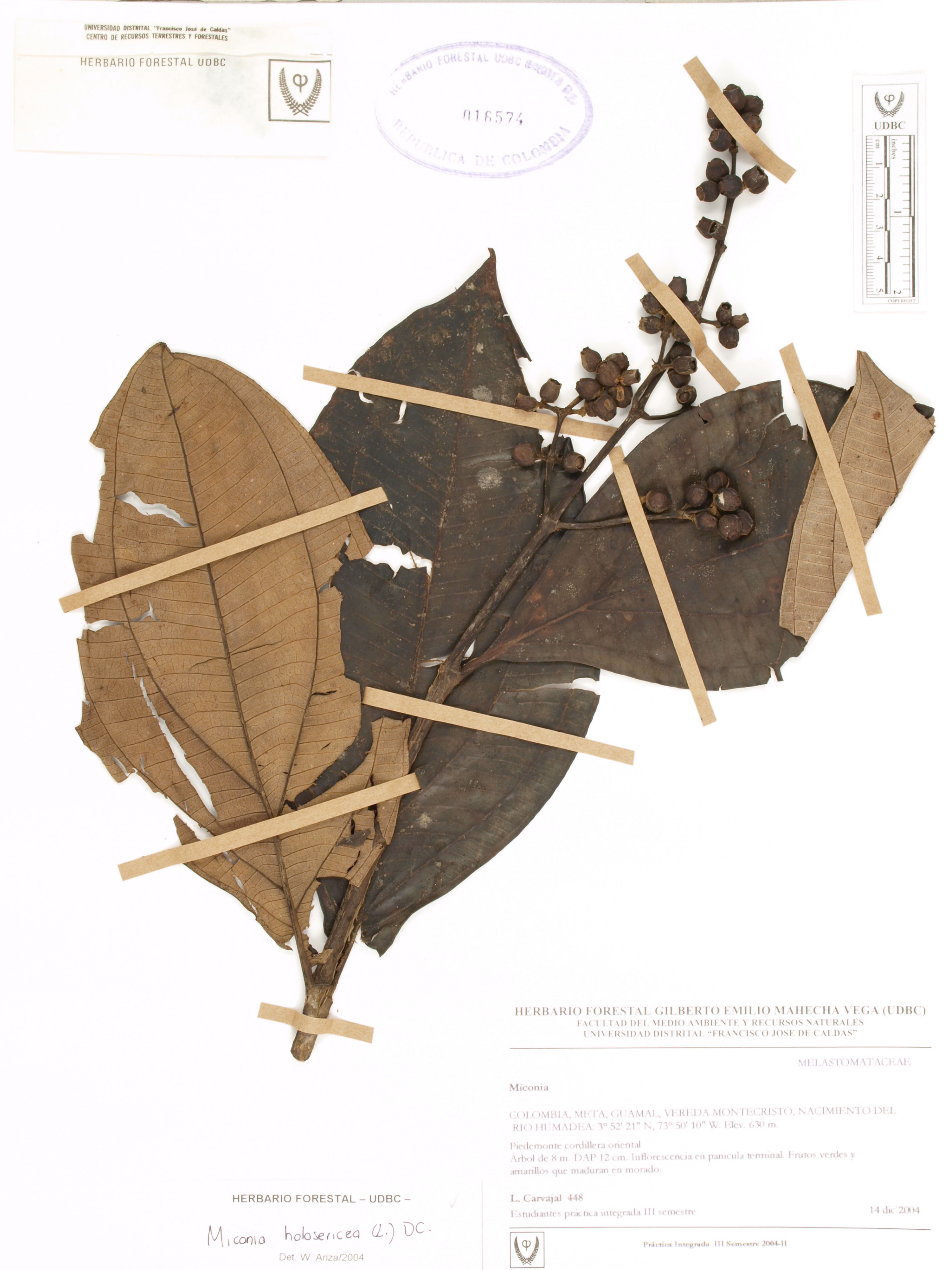 Fotografía del ejemplar Carvajal, L. 448, determinado como Miconia holosericea en el año 2004