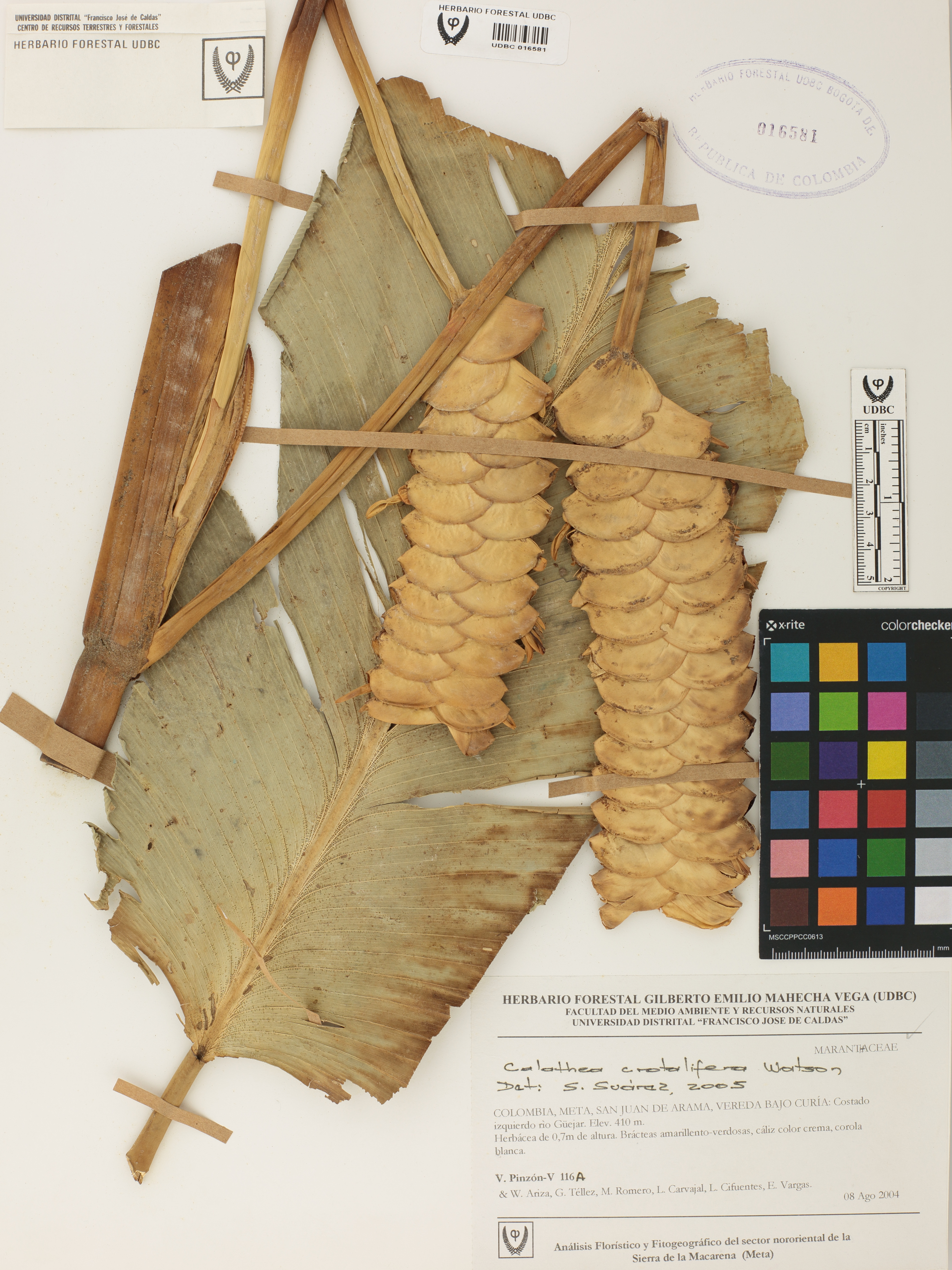 Fotografía del ejemplar Pinzón-V., V. 116, determinado como Calathea crotalifera en el año 2005