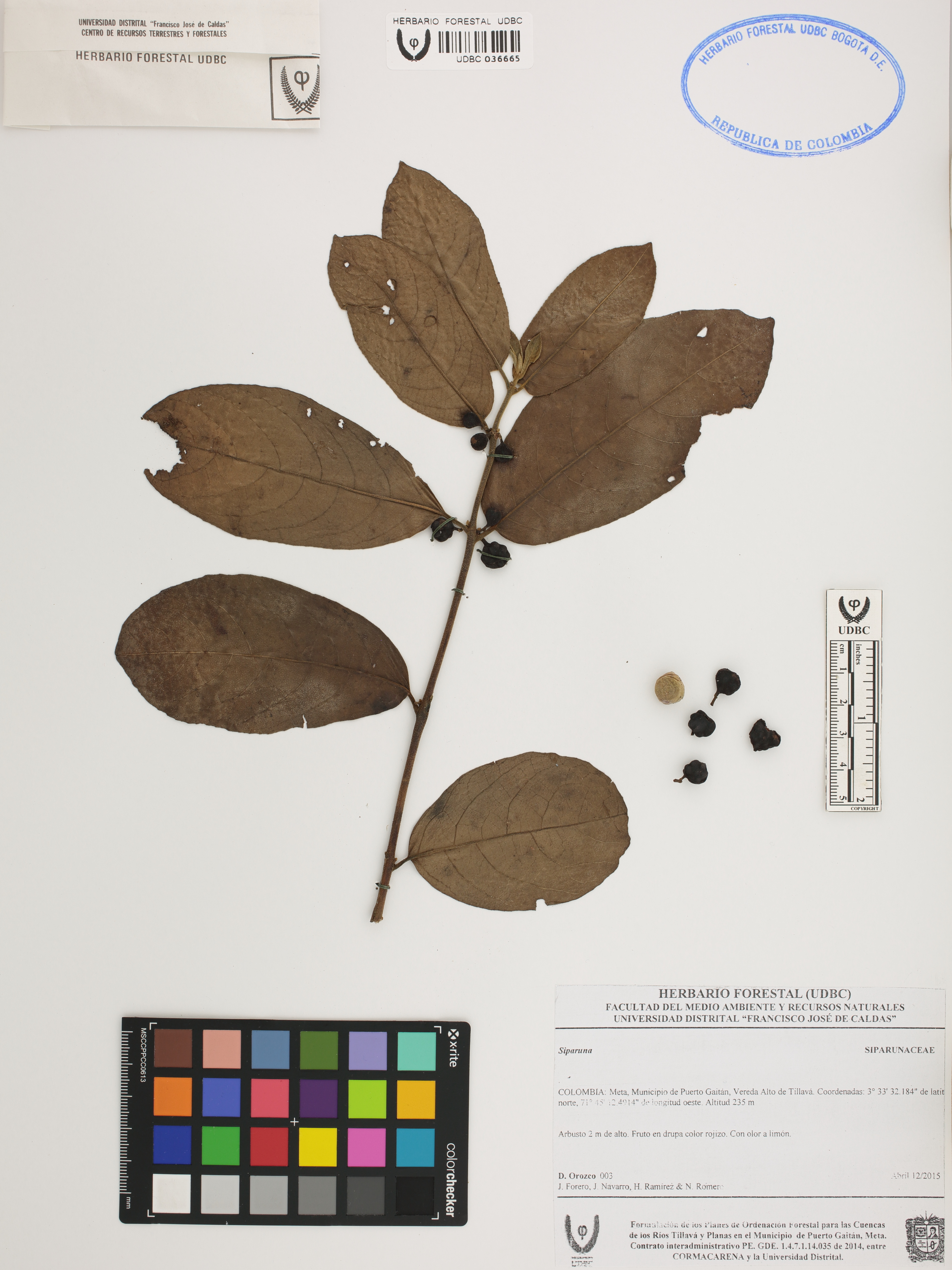 Fotografía del ejemplar Orozco, D. 3, determinado como Siparuna sp.