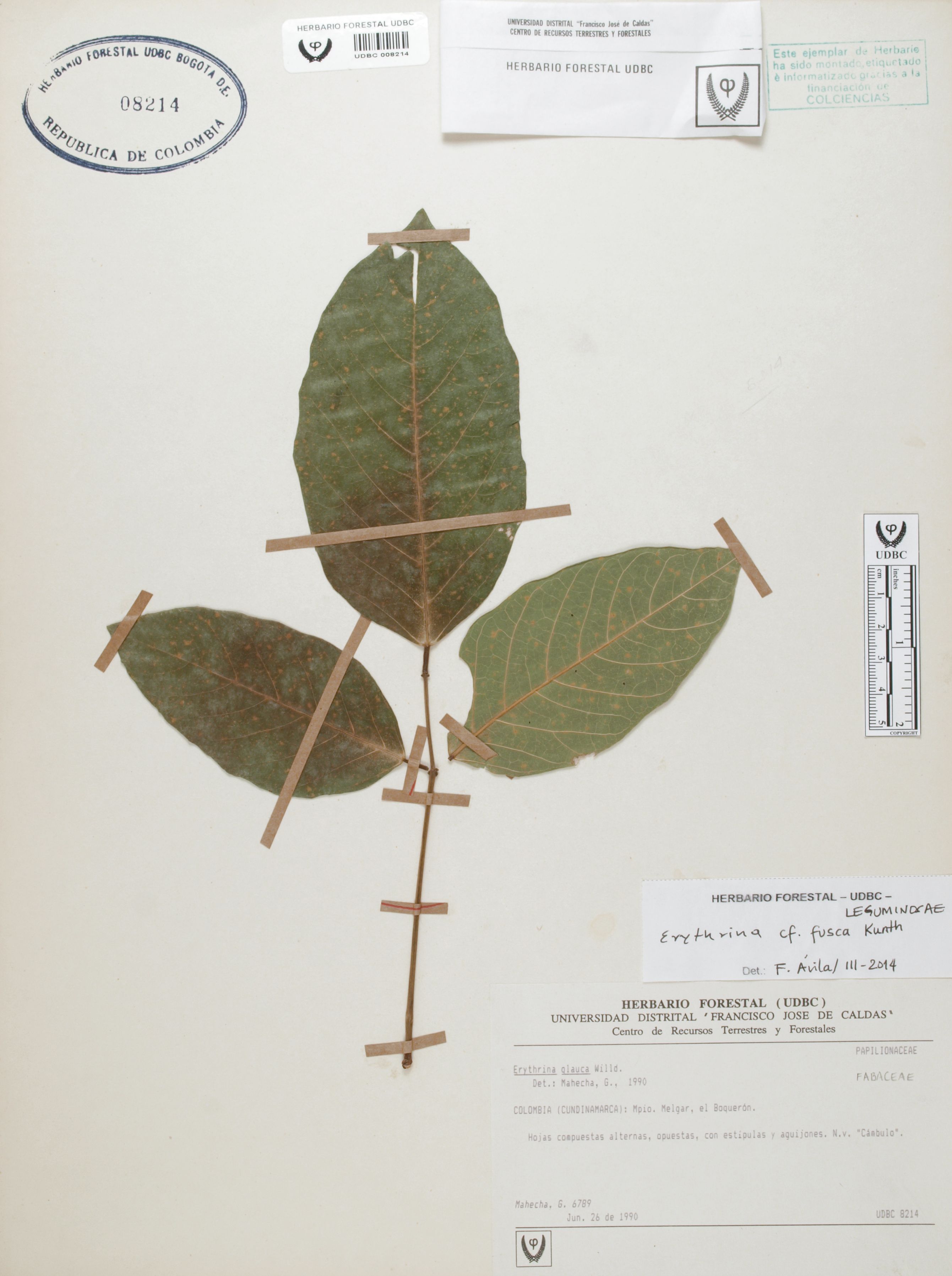 Fotografía del ejemplar Mahecha, G. 6789, determinado como Erythrina fusca en el año 2004