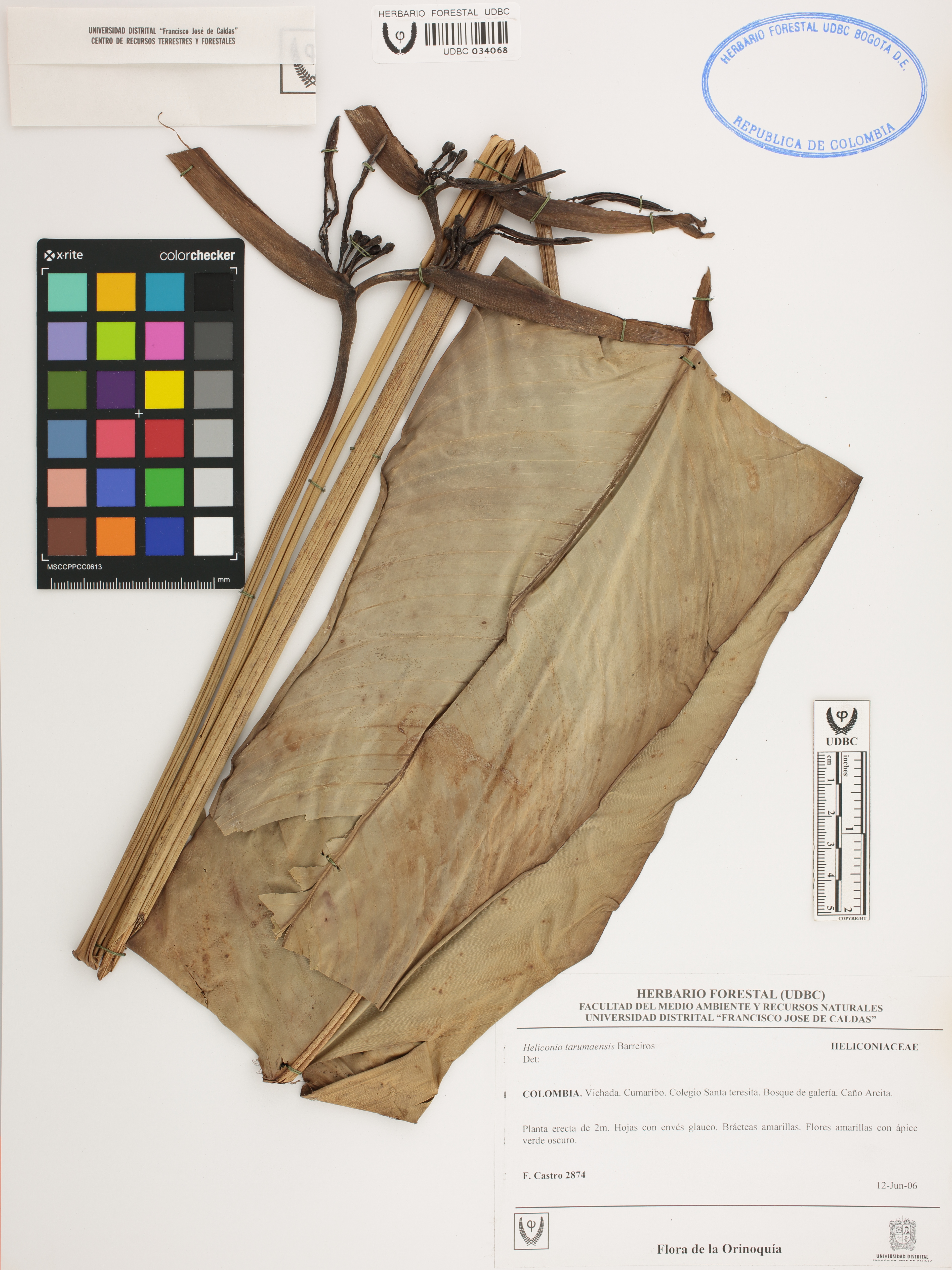 Fotografía del ejemplar Castro, F. 2874, determinado como Heliconia tarumaensis