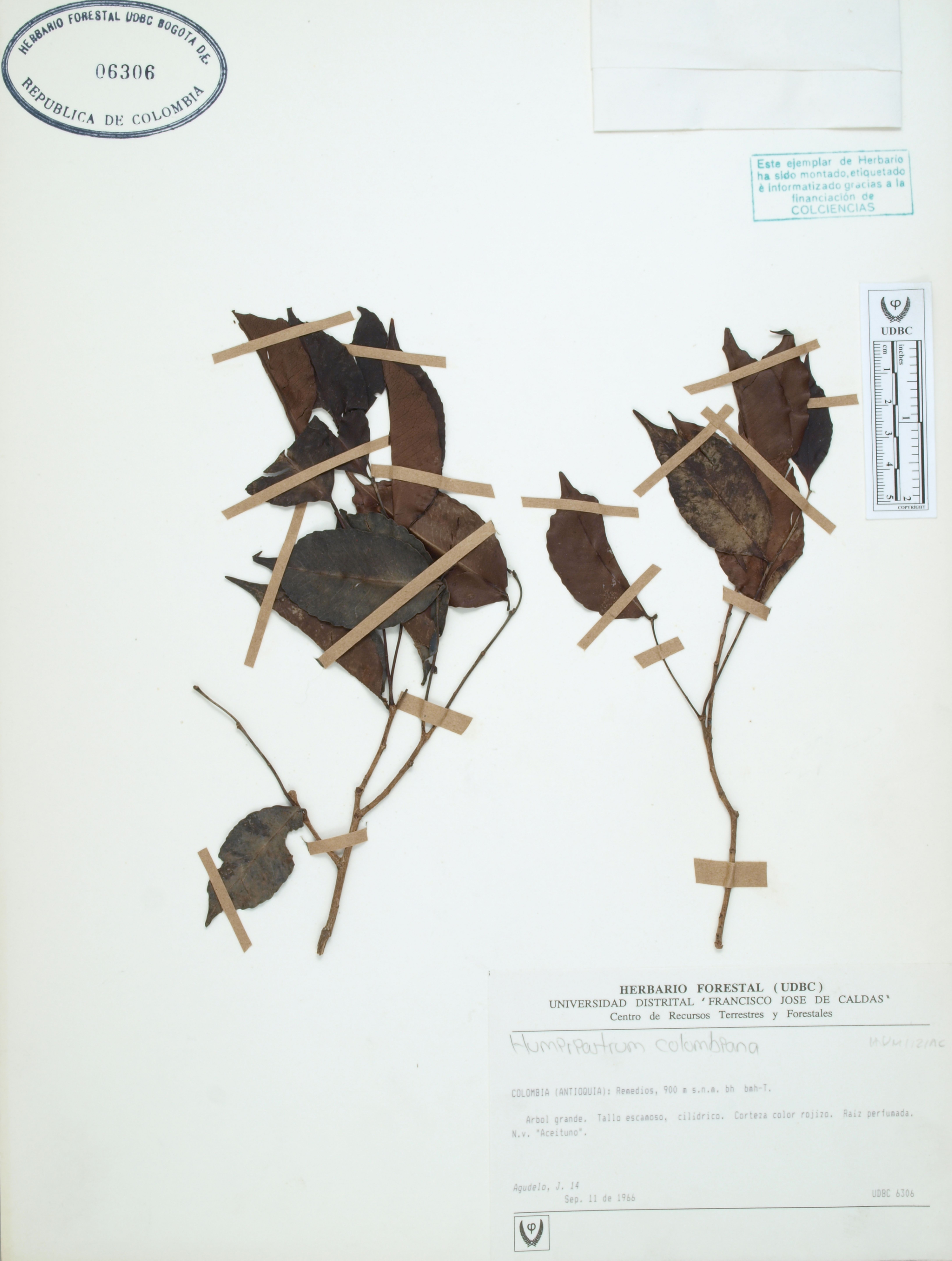 Fotografía del ejemplar Agudelo, J. 14, determinado como Humiriastrum colombianum