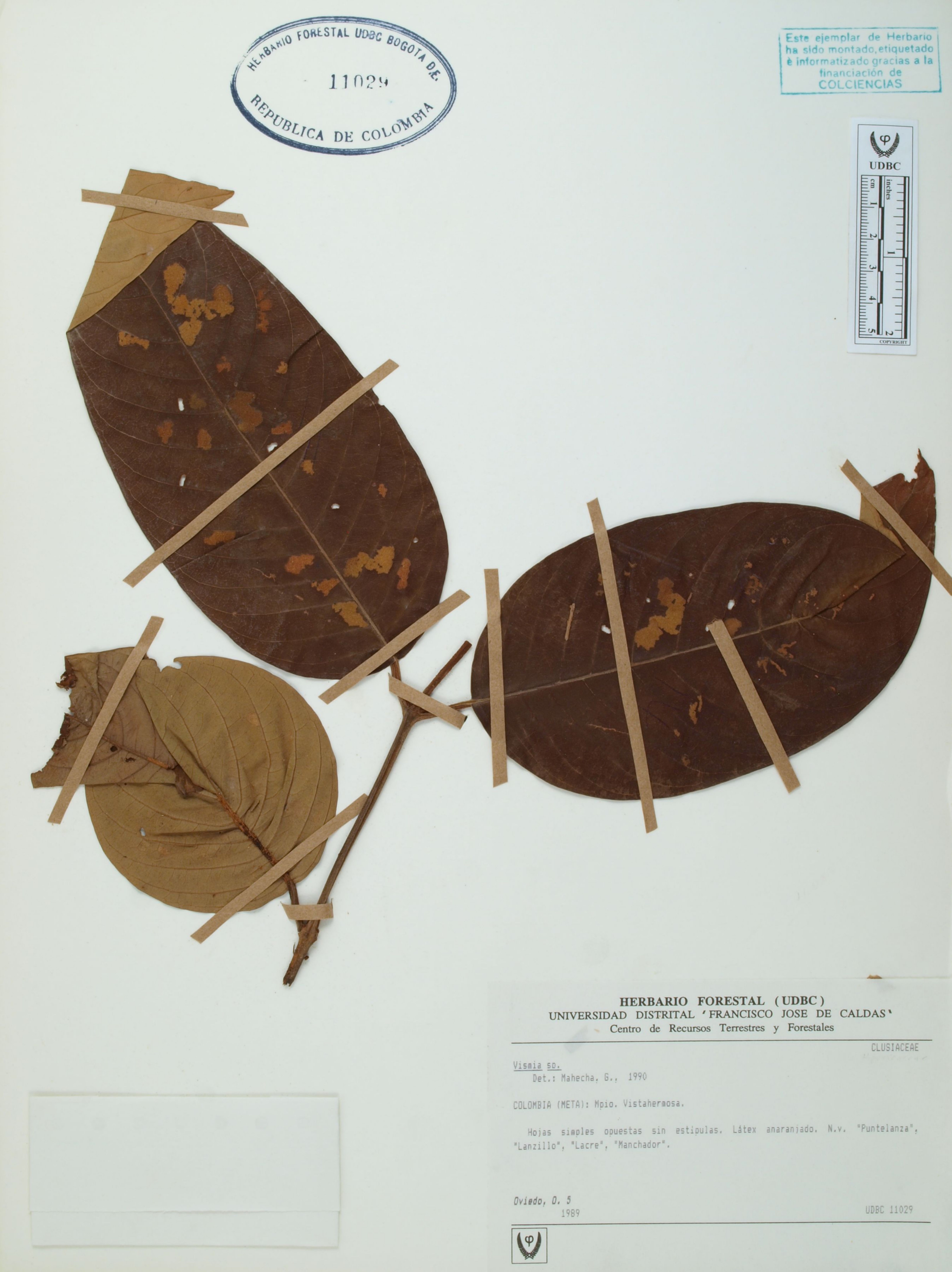 Fotografía del ejemplar Oviedo, O. 5, determinado como Vismia sp. en el año 1990