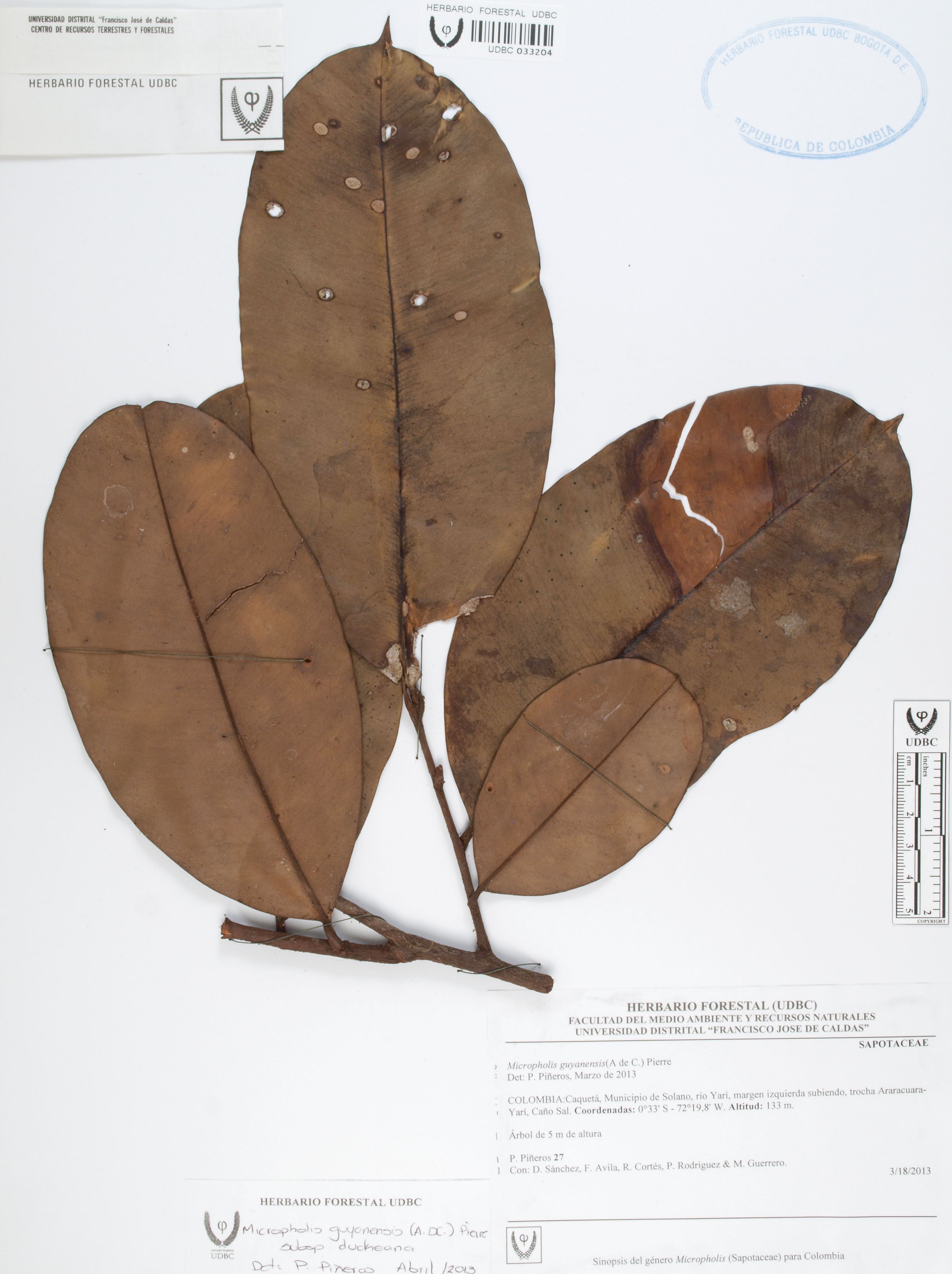 Fotografía del ejemplar Piñeros, P. 27, determinado como Micropholis guyanensis subsp. duckeana en el año 2013
