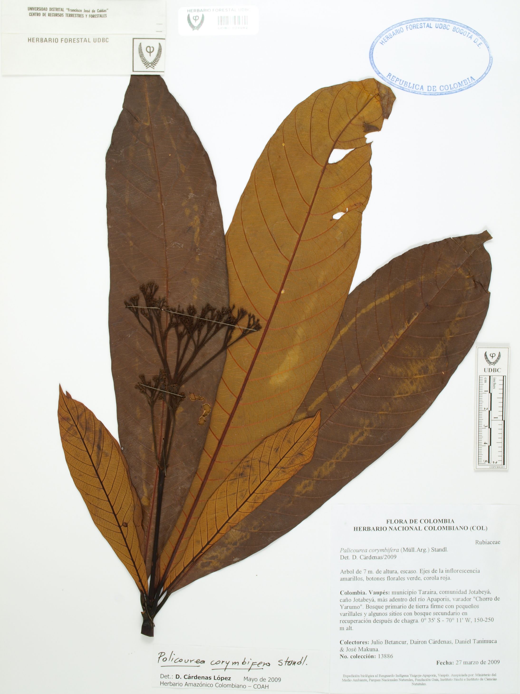 Fotografía del ejemplar Betancur, J. 13886, determinado como Palicourea corymbifera en el año 2009