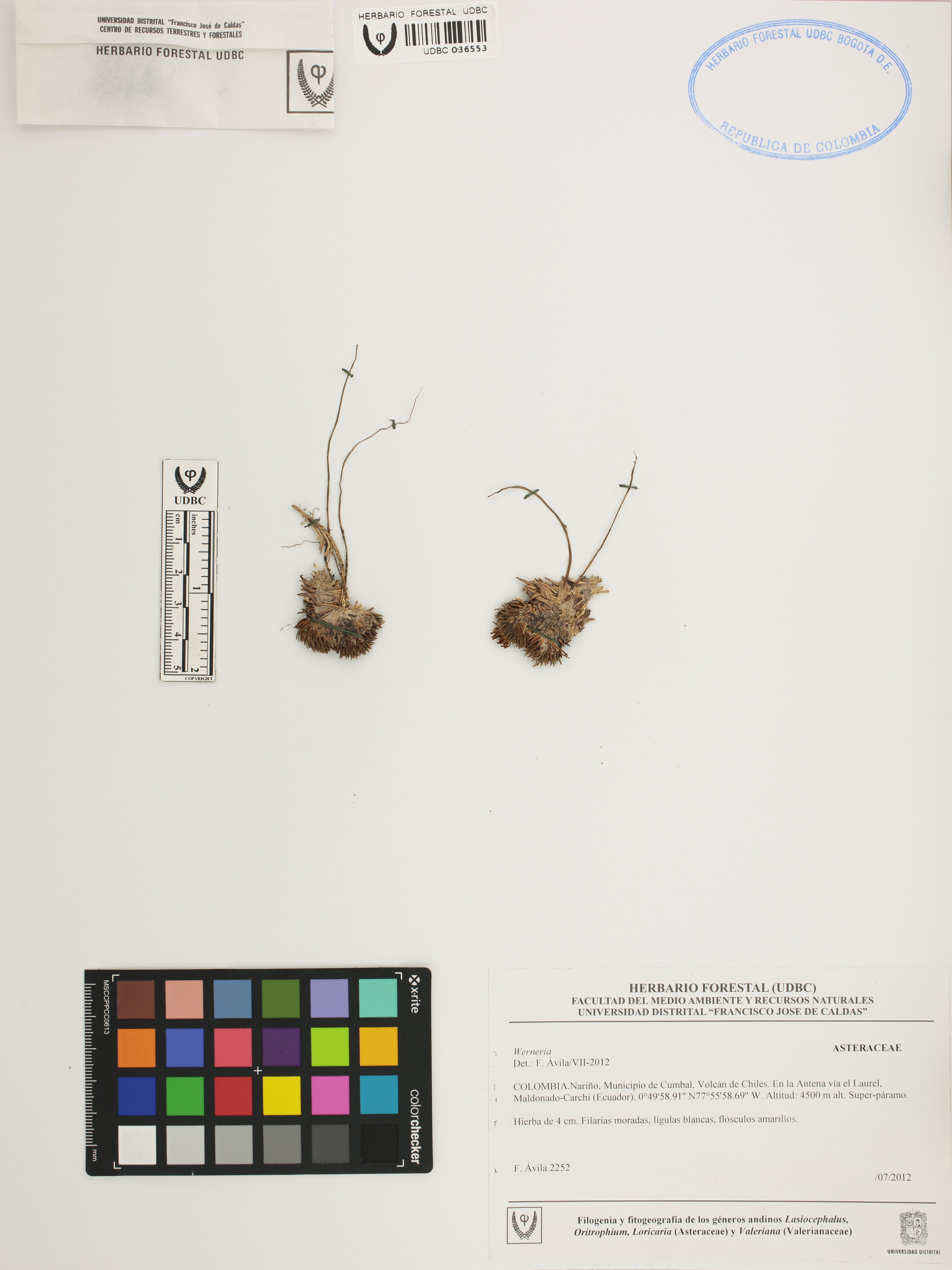 | dc.description | Fotografía del ejemplar Ávila, F. 2252, determinado como Werneria sp. en el año 2012 | |