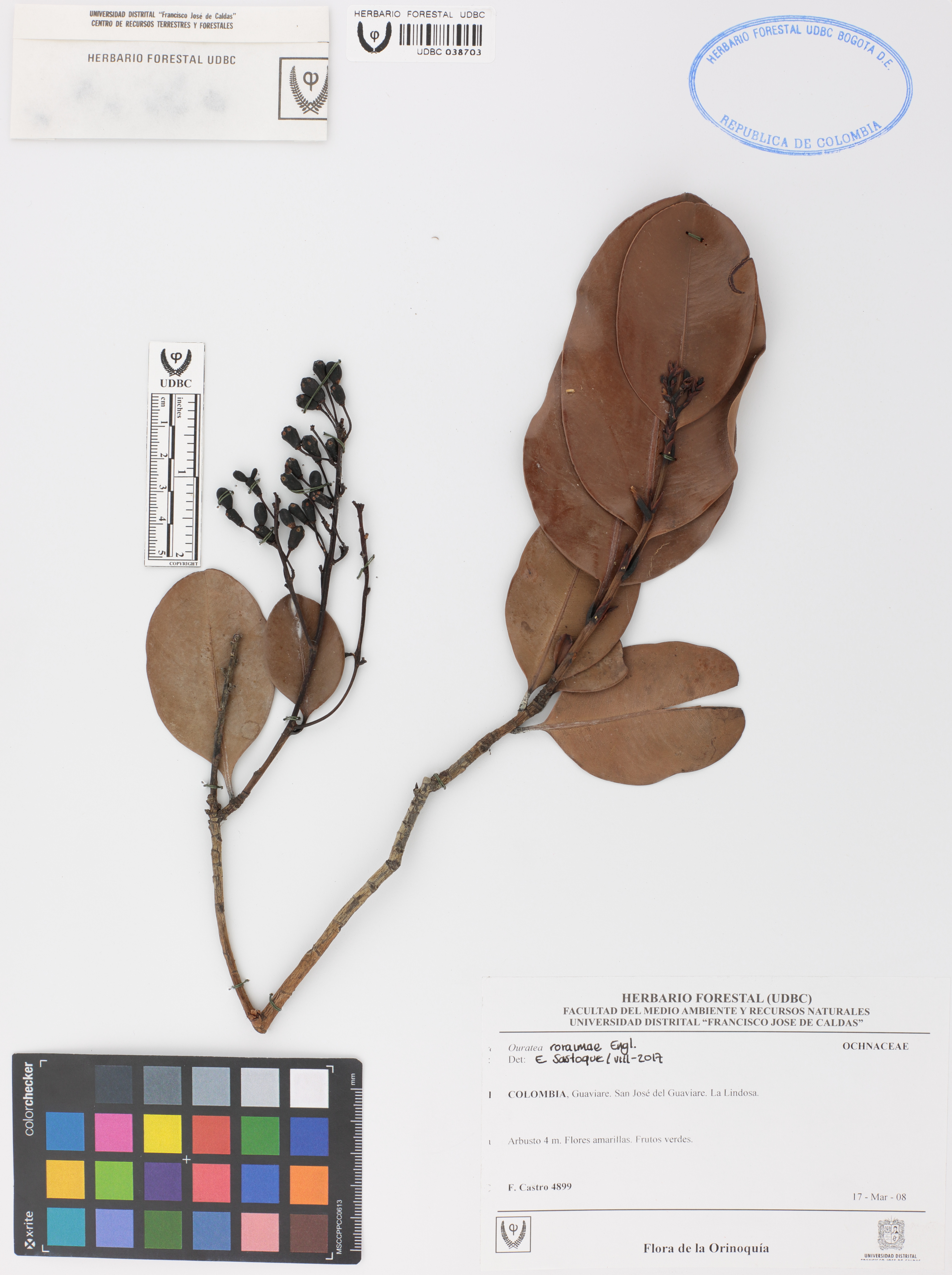 Fotografía del ejemplar Castro, F. 4899, determinado como Ouratea roraimae en el año 2017