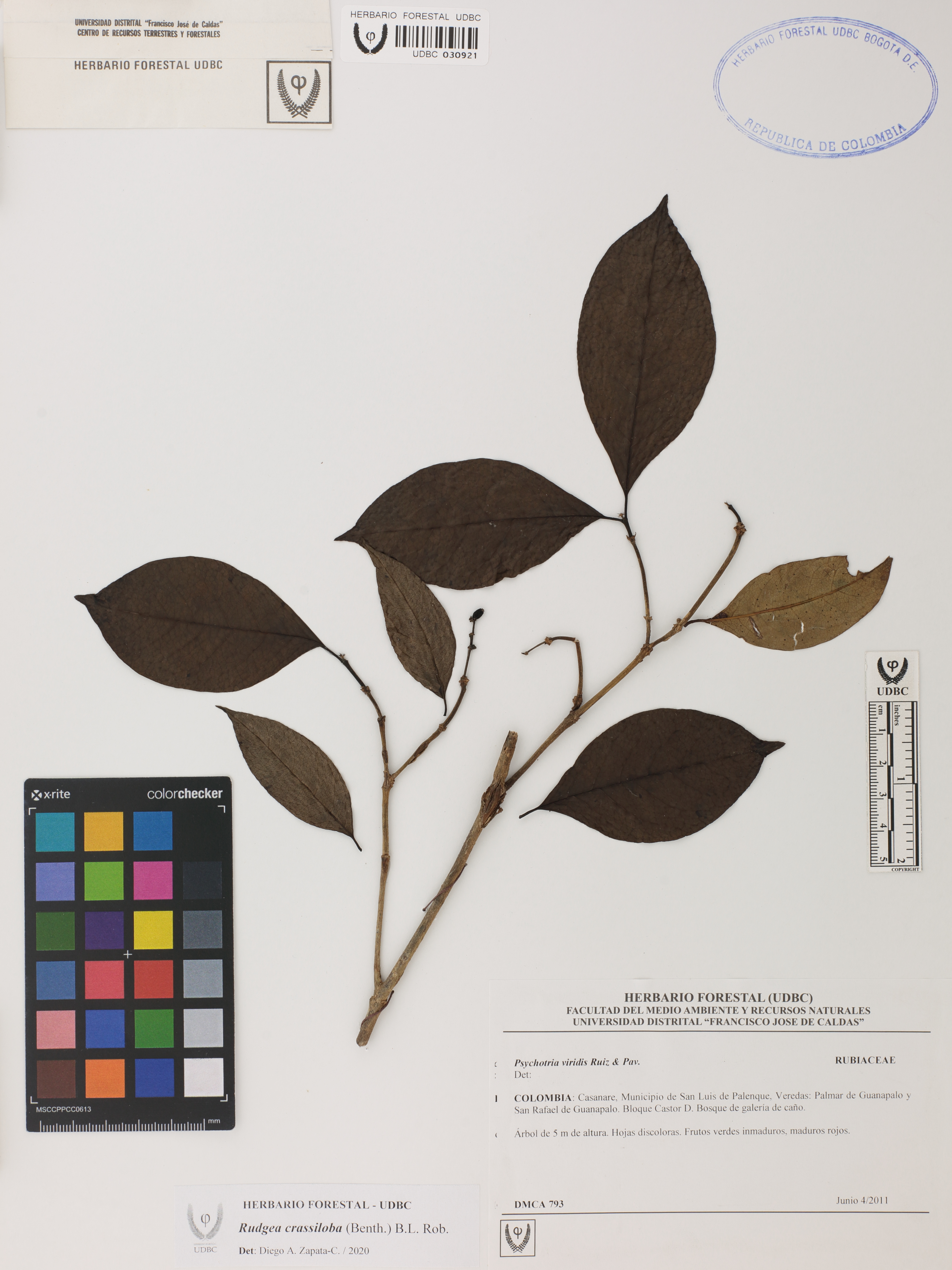 Fotografía del ejemplar DMCA, 793, determinado como Rudgea crassiloba en el año 2020